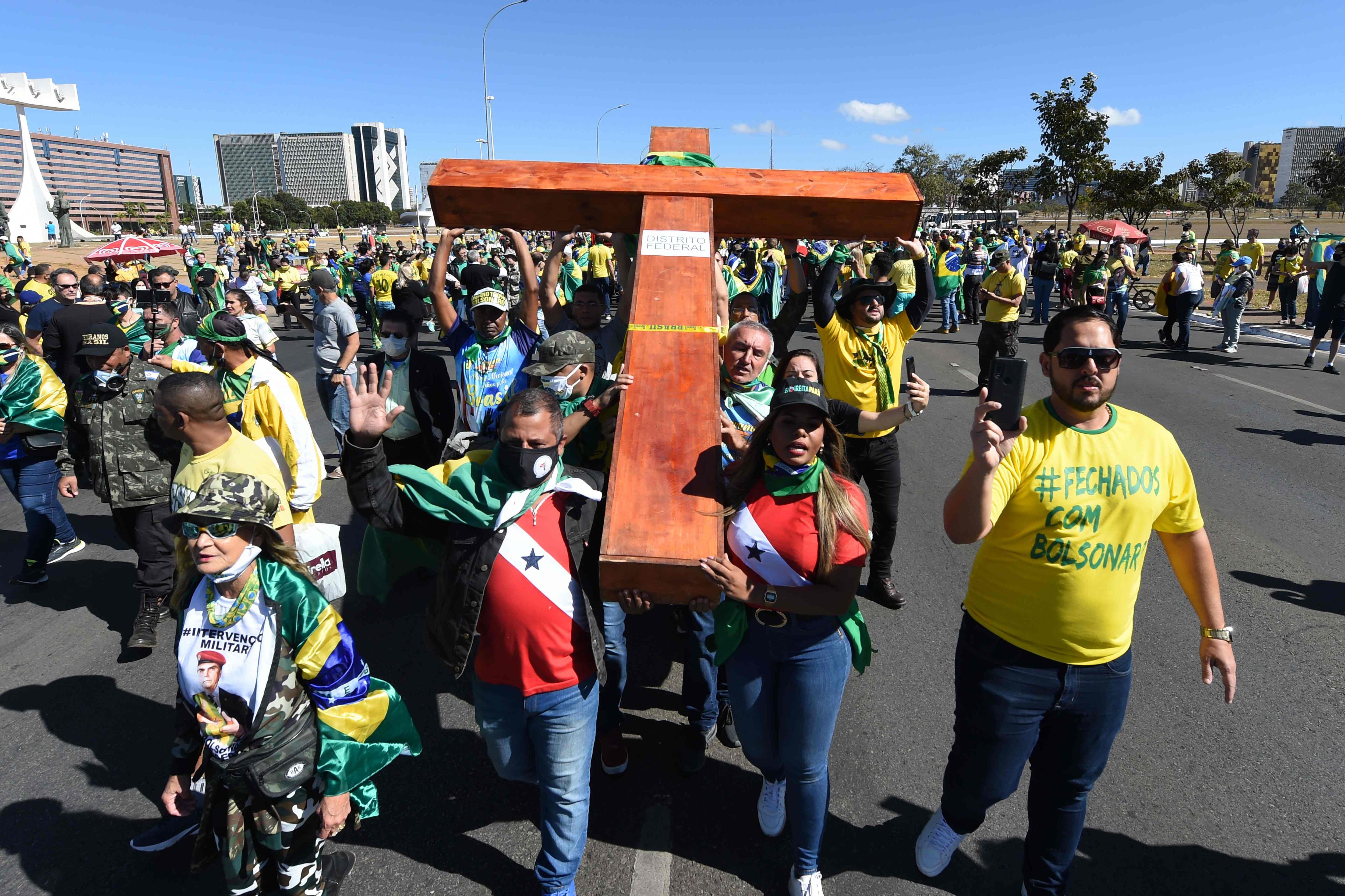 Ataviados con los colores de la bandera de Brasil, los manifestantes desfilaron por la Explanada de los Ministerios, en el corazón de la capital, portando símbolos patrióticos, cruces e imágenes del mandatario, quien aparenta estar en buen estado de salud, reposando en la residencia oficial.