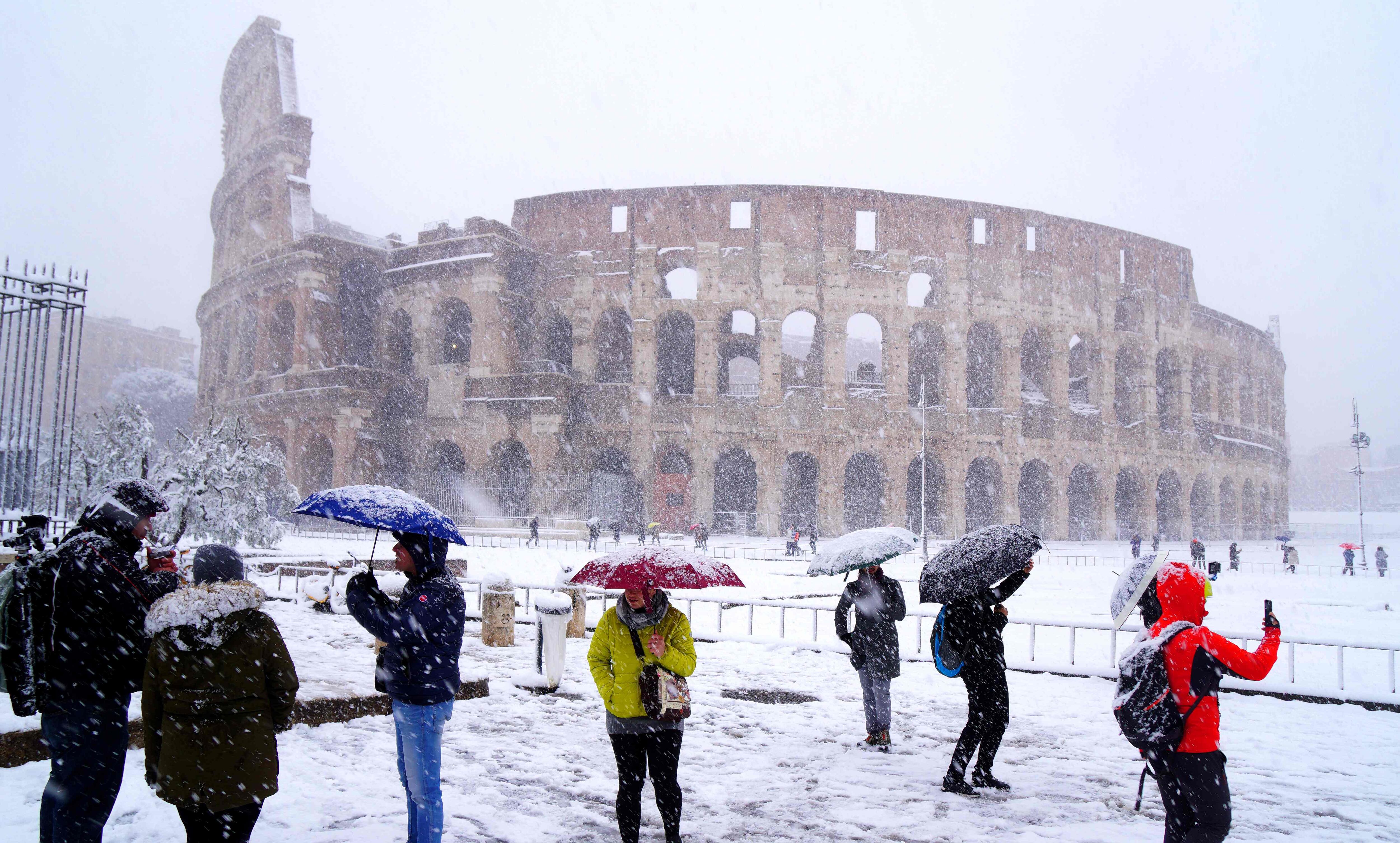 Los servicios de tren, avión y autobús de Roma quedaron paralizados y la agencia de protección civil de Italia incluso movilizó al Ejército para ayudar a limpiar las calles cubiertas de aguanieve, ya que la ciudad acostumbrada a los inviernos suaves estaba cubierta por una gruesa capa de nieve.