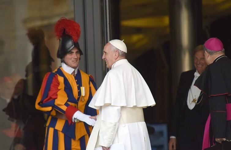 Además del casco con plumas rojas, ya que en este caso se trataba de un alarbadero, el uniforme de gala lleva pantalones bombachos y una chaqueta con el famoso cuello blanco. Según el fotógrafo de la AFP, el papa Francisco se acercó al final de la audiencia a hablar con un miembro de la Guardia Suiza, lo que no suele hacer.
