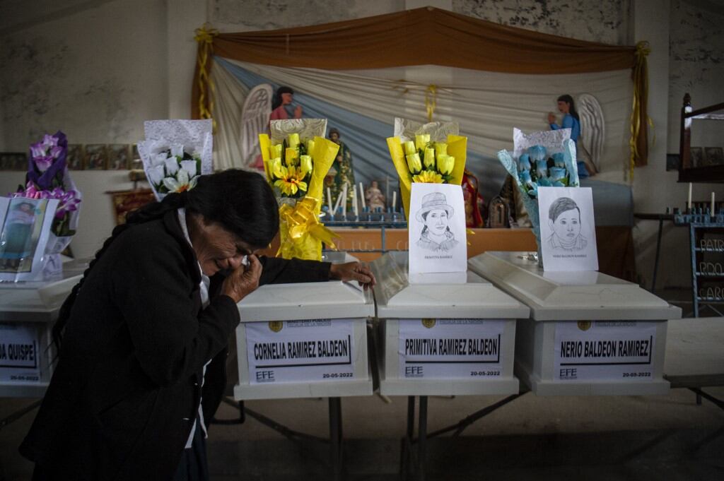 Decenas de pequeños ataúdes blancos con los restos de las víctimas, con crucifijos plateados en la cubierta, fueron velados durante dos días en la iglesia del pueblo por sus parientes. “Yo perdí a mi madre y a mis cinco hermanos”, dijo con lágrimas a la AFP Teófila Ochoa, quien tenía 11 años y se salvó corriendo al campo el fatídico día.