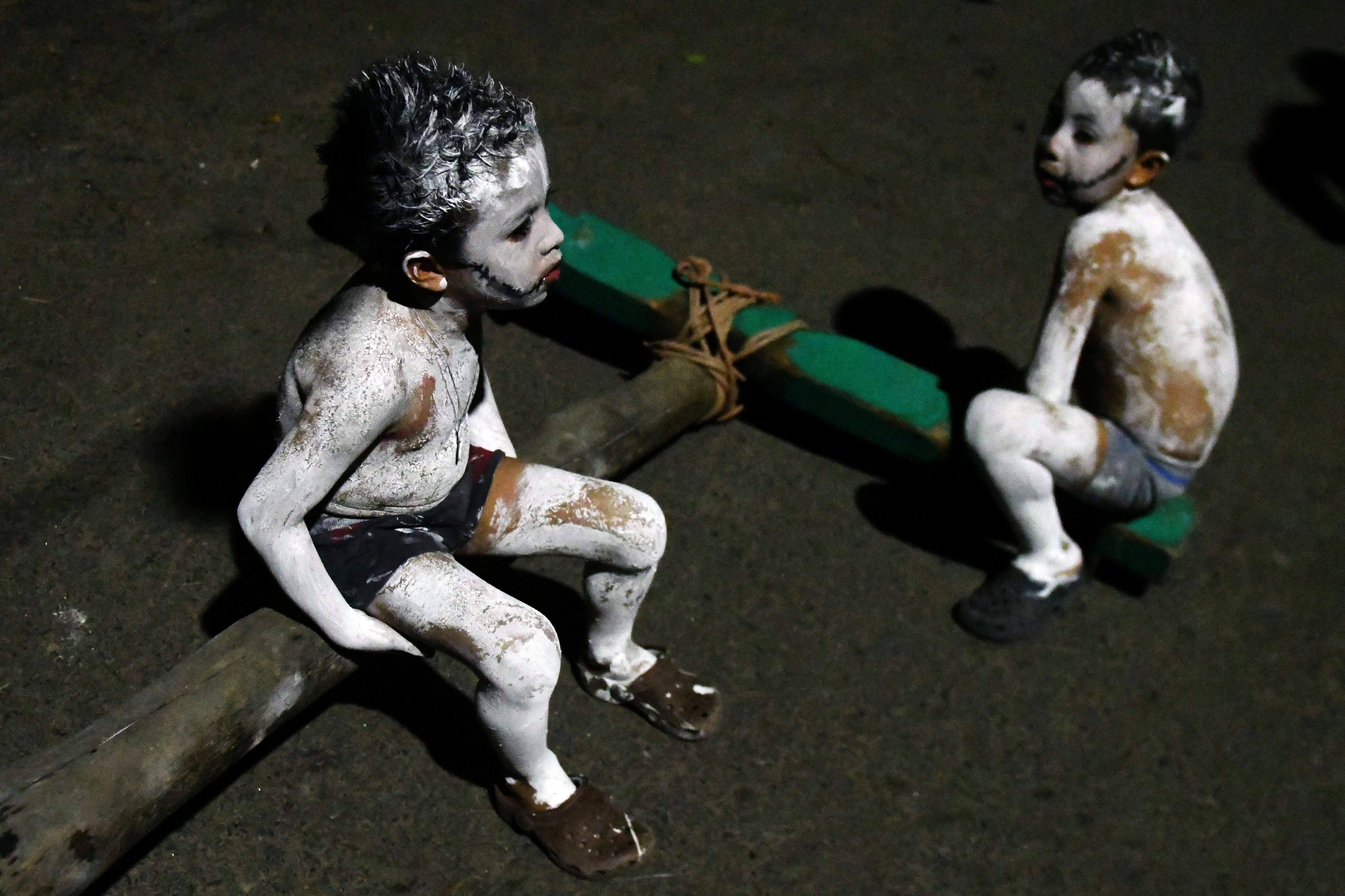 Tonacatepeque, El Salvador. Con piel ceniza para simular la esquelética muerte en transición al más allá, jóvenes con gritos despavoridos dan vida a la Calabiuza (calavera), una festividad que se contrapone al Halloween, en la noche de todos los santos en Tonacatepeque, El Salvador.