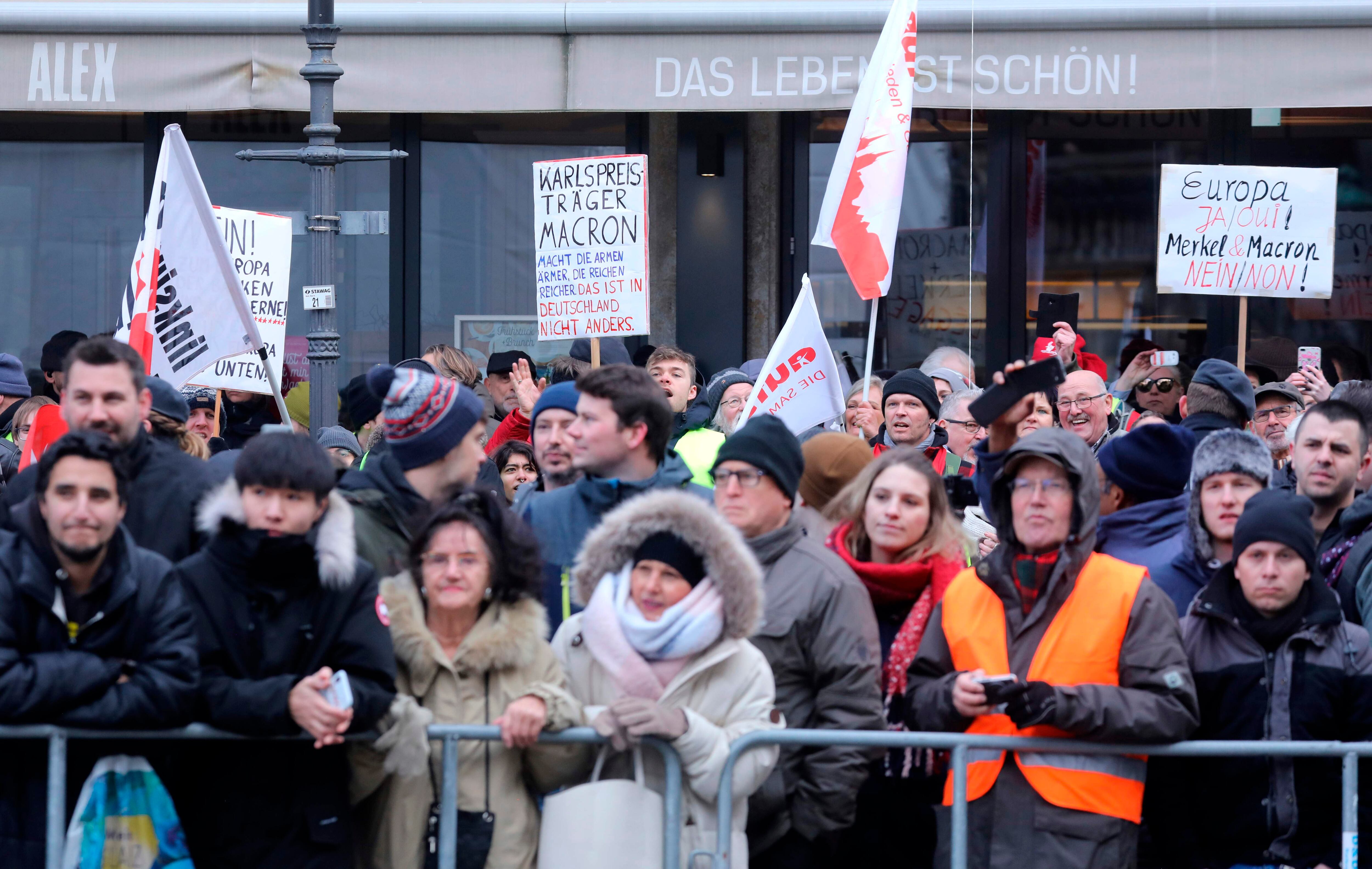 Al llegar el martes a Aquisgrán, capital durante el imperio de Carlomagno, delante del Ayuntamiento del siglo XIV, los dos dirigentes fueron abucheados por unas decenas de personas, algunas con chalecos amarillos, símbolo de protesta social sin precedentes que atraviesa Francia.