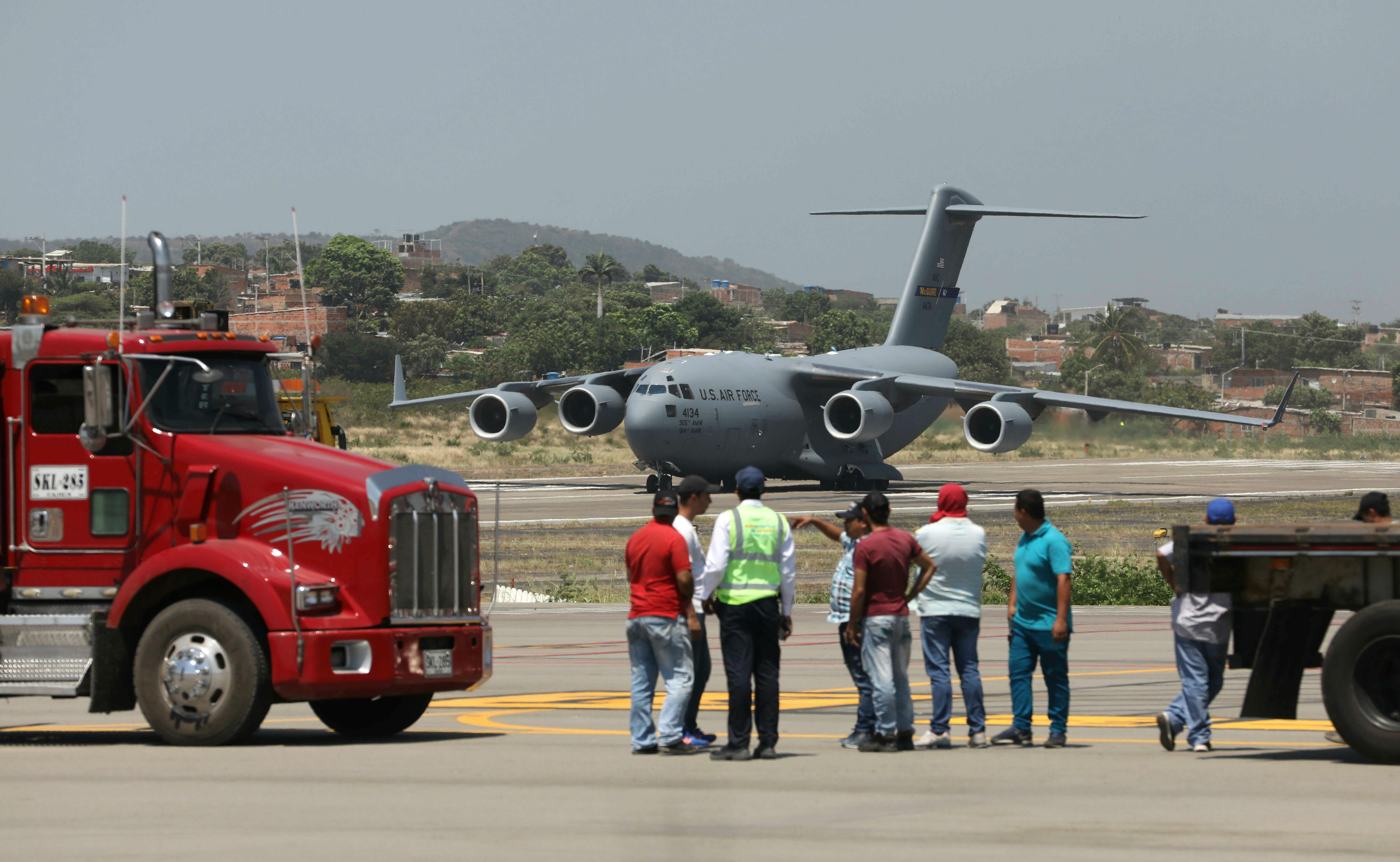 El primero de tres naves militares C-17, con toneladas de ayuda, arribó pasada la 1 p. m. al aeropuerto internacional Camilo Daza de la ciudad de Cúcuta, fronteriza con Venezuela, donde opera uno de los cuatro centros de acopio internacionales que se abrieron con el apoyo de Estados Unidos, Colombia y otros países.