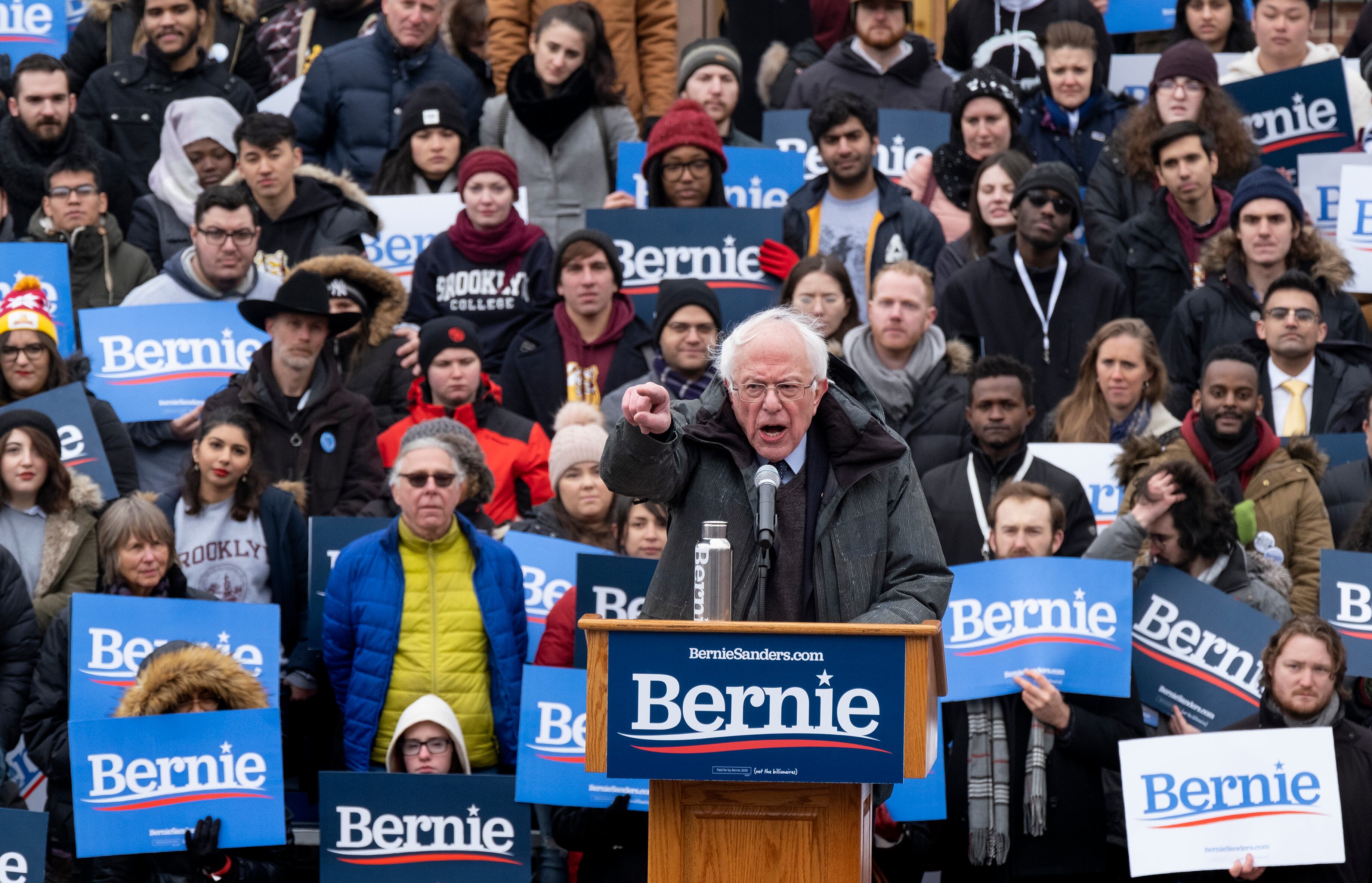 El senador de 77 años las fue enumerando delante de las 3.000 personas congregadas en el campus de la universidad pública del Brooklyn College, cubierto por una fina capa de nieve.