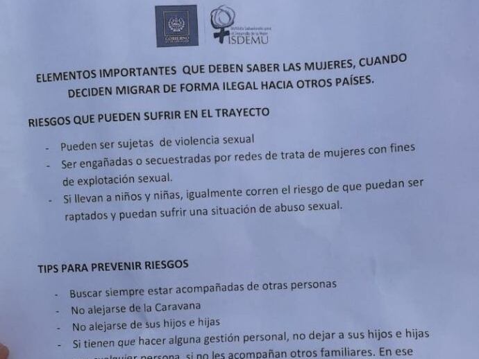 En la hoja que entregaron los del ISDEMU se recomendaba "buscar siempre estar acompañados de otras personas", "no alejarse de la caravana", "no alejarse de sus hijos e hijas", entre otros. "Si tienen que hacer alguna gestión personal, no dejar a sus hijos e hijas con cualquier persona, si no les acompañan otros familiares. En ese caso, buscar las instituciones que acompañan", se aconseja.