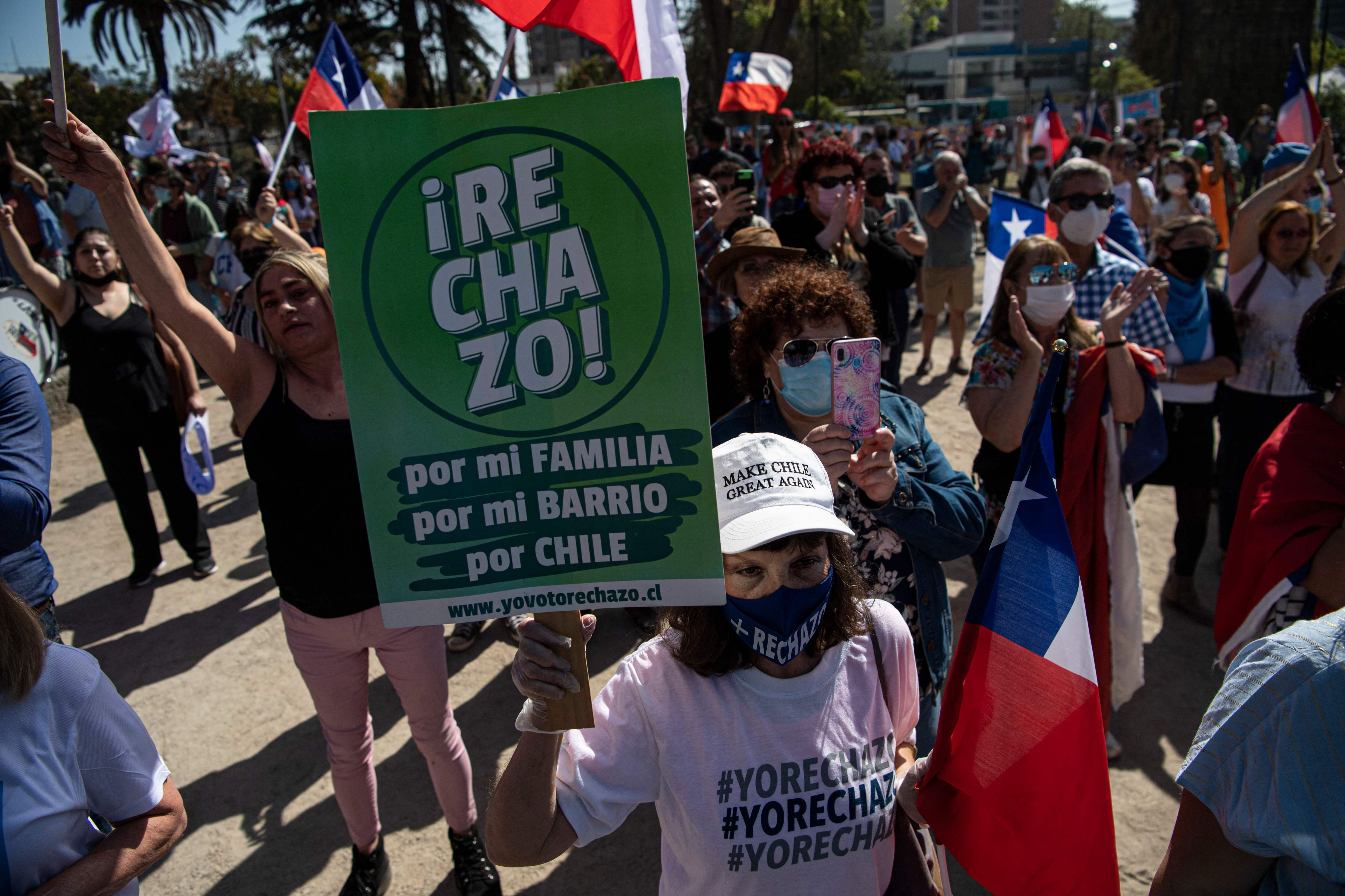 Santiago. Cientos de personas se manifestaron este sábado en Santiago para mostrar su rechazo a la nueva Constitución que se redacta en Chile, en reemplazo de la promulgada en 1980 por la dictadura de Augusto Pinochet y que tendrá que validarse en setiembre en un plebiscito de voto obligatorio.