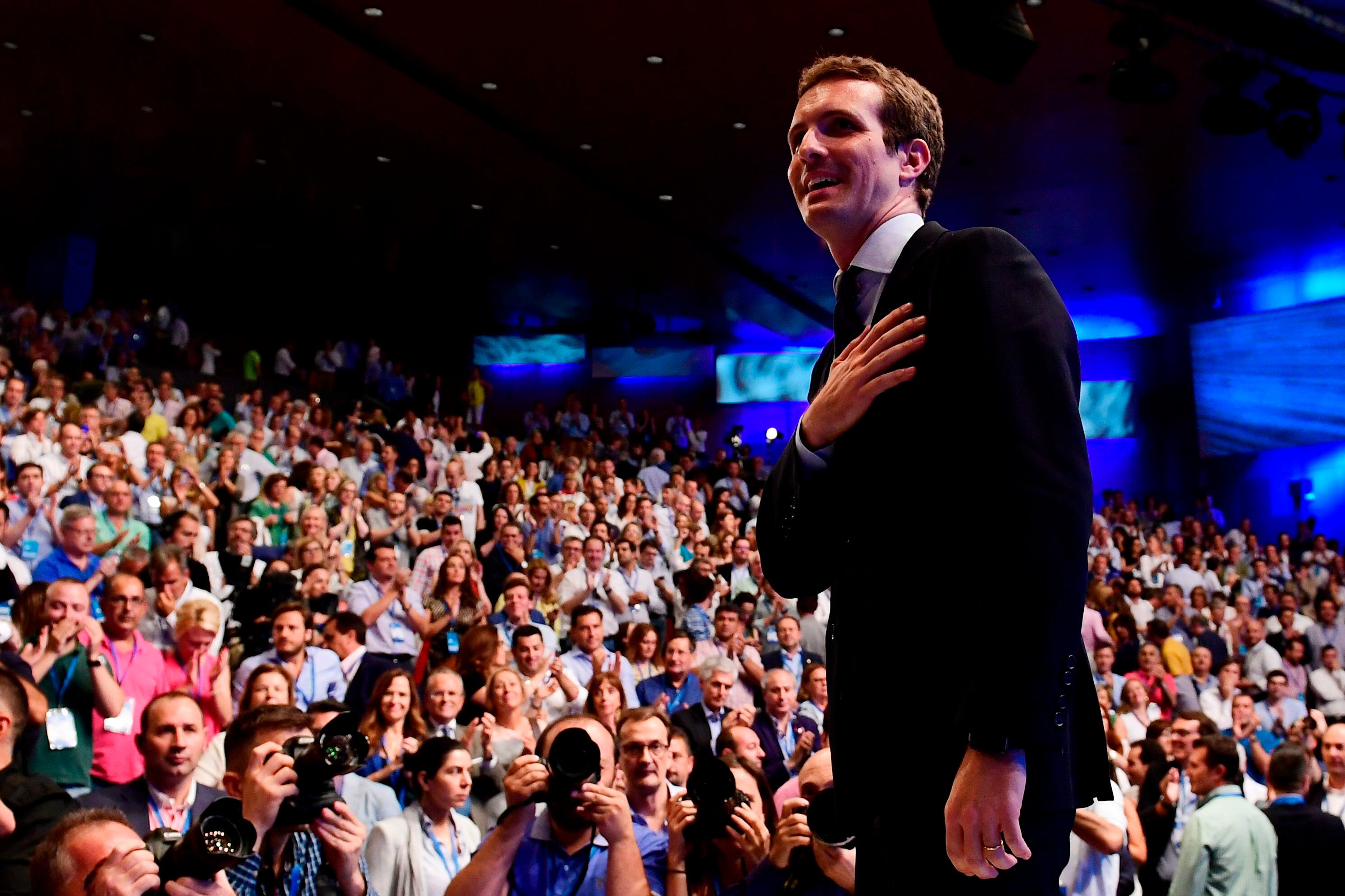 “Hoy comienza una nueva etapa”, porque el PP sale a “a intentar reconquistar el corazón de todos los españoles, después de las semanas tan duras que hemos tenido que vivir como formación política”, dijo Casado en su discurso de la victoria, refiriéndose a la moción de censura de los socialistas que el 1.° de junio desalojaron del poder a Rajoy.