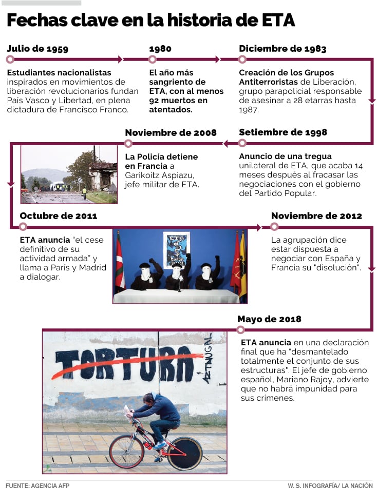Fundada en 1959 bajo la dictadura de Francisco Franco, ETA protagonizó mas de 40 años de violencia por la independencia del País Vasco y Navarra que dejaron un rastro de al menos 853 víctimas mortales.