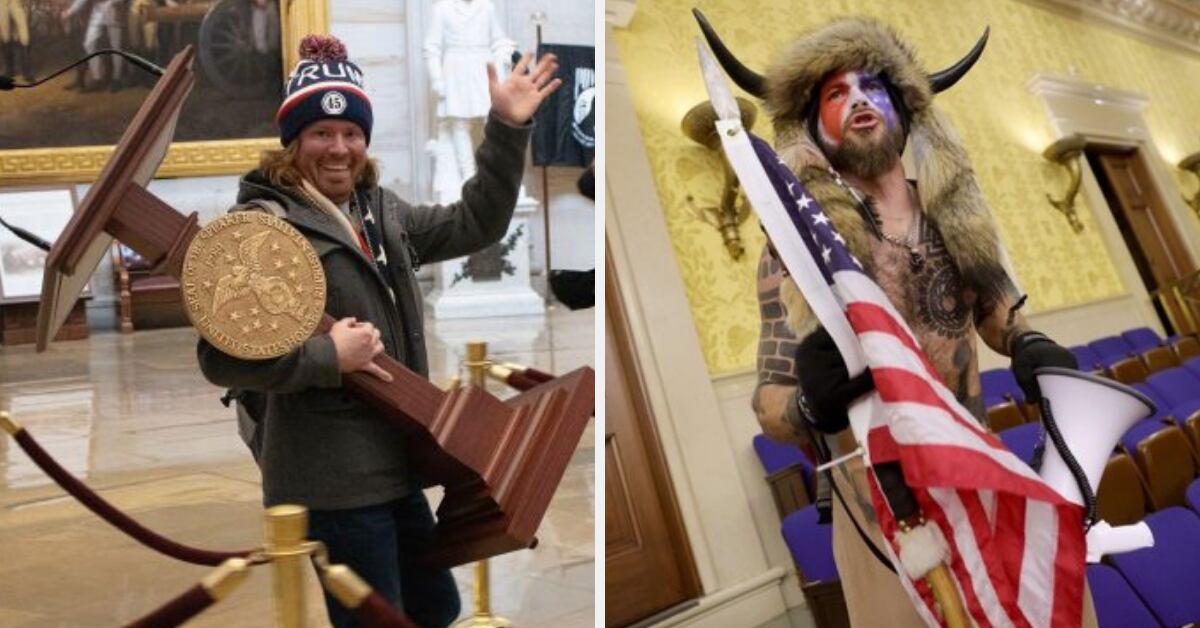 Uno de ellos es Adam Johnson, de 36 años, quien fue fotografiado cargando el atril de la presidenta de la Cámara de Representantes, Nancy Pelosi, y el otro es Jake Angeli, un conocido partidario de las teorías de conspiración de QAnon que irrumpió en el Capitolio disfrazado con cuernos de bisonte.