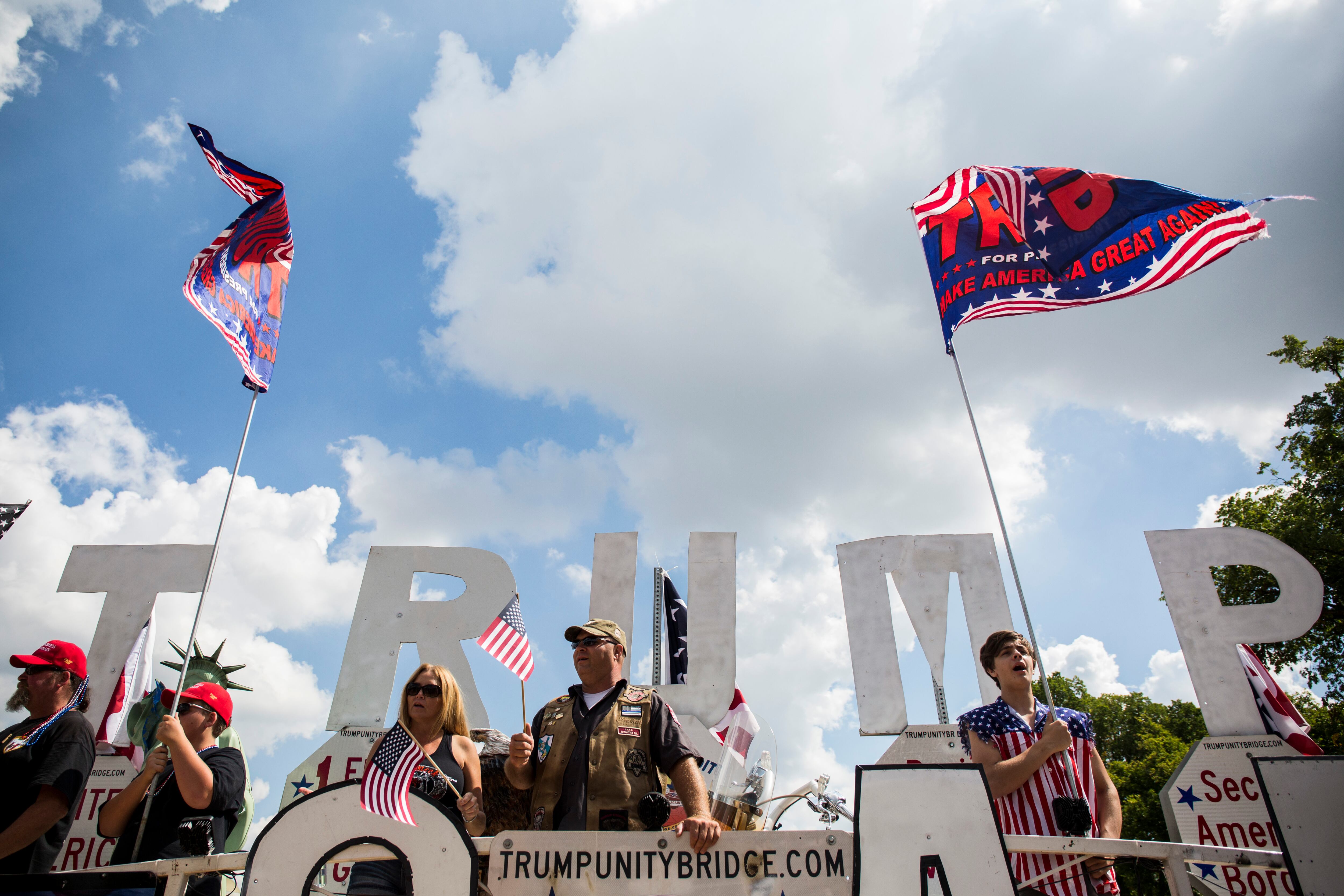 Donald Trump también tuiteó una imagen de un tren que avanza con una visera gigante con su lema de campaña "Make America Great Again" en la locomotora, y otro de él mismo tirando de una plataforma con productos estadounidenses (carbón, autos, ordenadores y galletas Oreo) sobre el océano.
