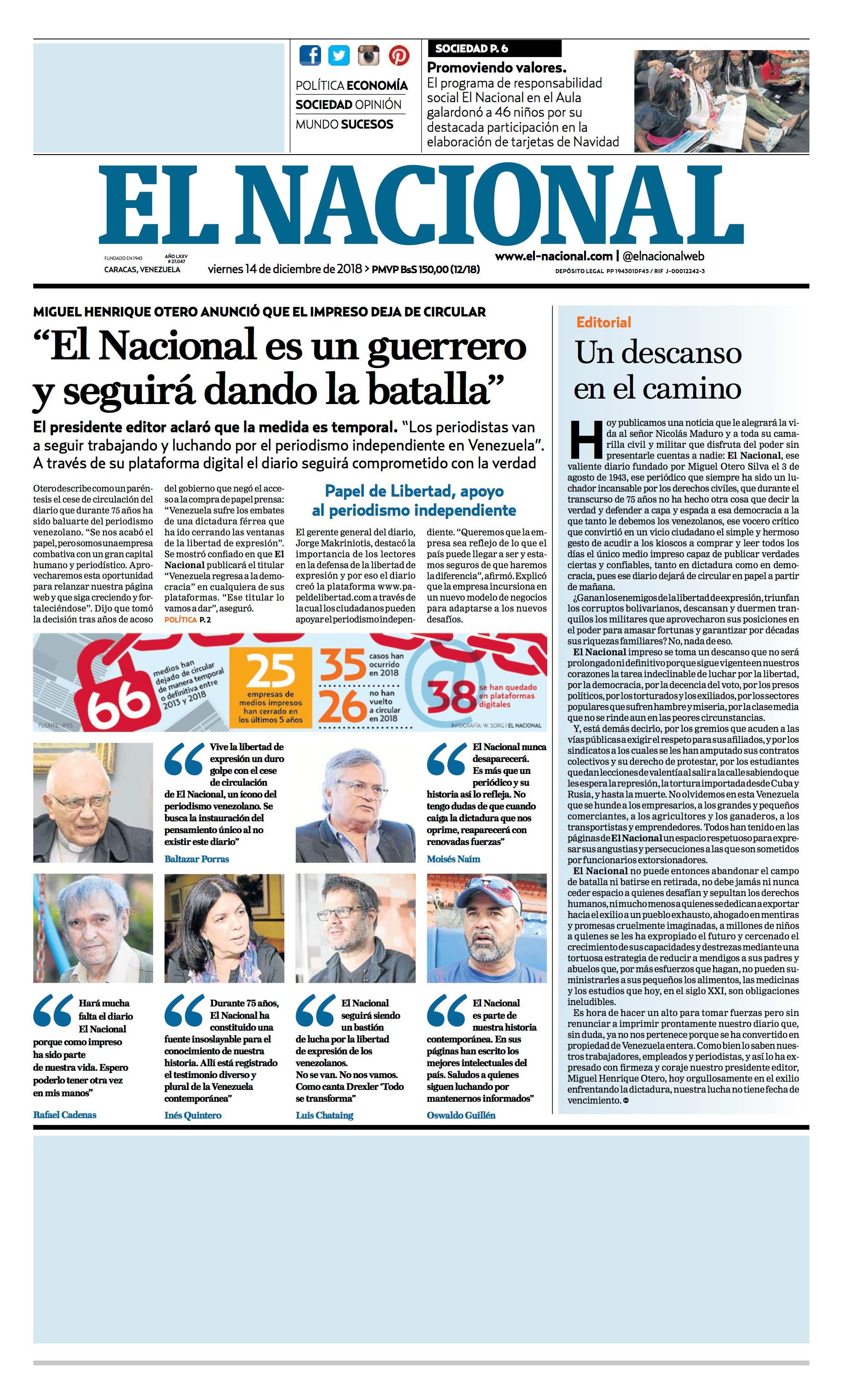 #13Dic Mensaje de Miguel Henrique Otero, presidente y director del diario El Nacional de Venezuela | Mañana publica su último ejemplar impreso, pero la lucha sigue.#EstamosASuLado #Solidaridad#ENSolidaridadPMA pic.twitter.com/o757vDTmCD - @EduardoAQuiros