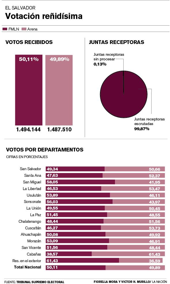 Sánchez Cerén supera con 50,11% a Quijano, que obtuvo el 49,89% , según el escrutinio de casi el 100% de las mesas.
