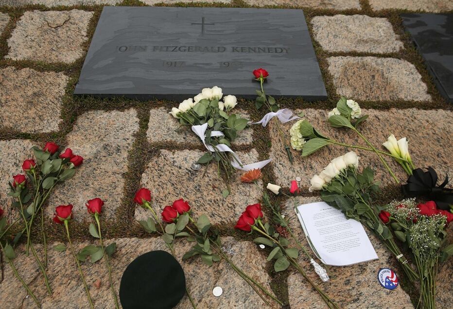 Poco después del amanecer, el secretario de Justicia, Eric Holder, concurrió a la tumba recientemente refaccionada de Kennedy en el Cementerio Nacional de Arlington, donde un oficial de caballería británico montaba guardia y sonaban gaitas junto a la llama eterna.