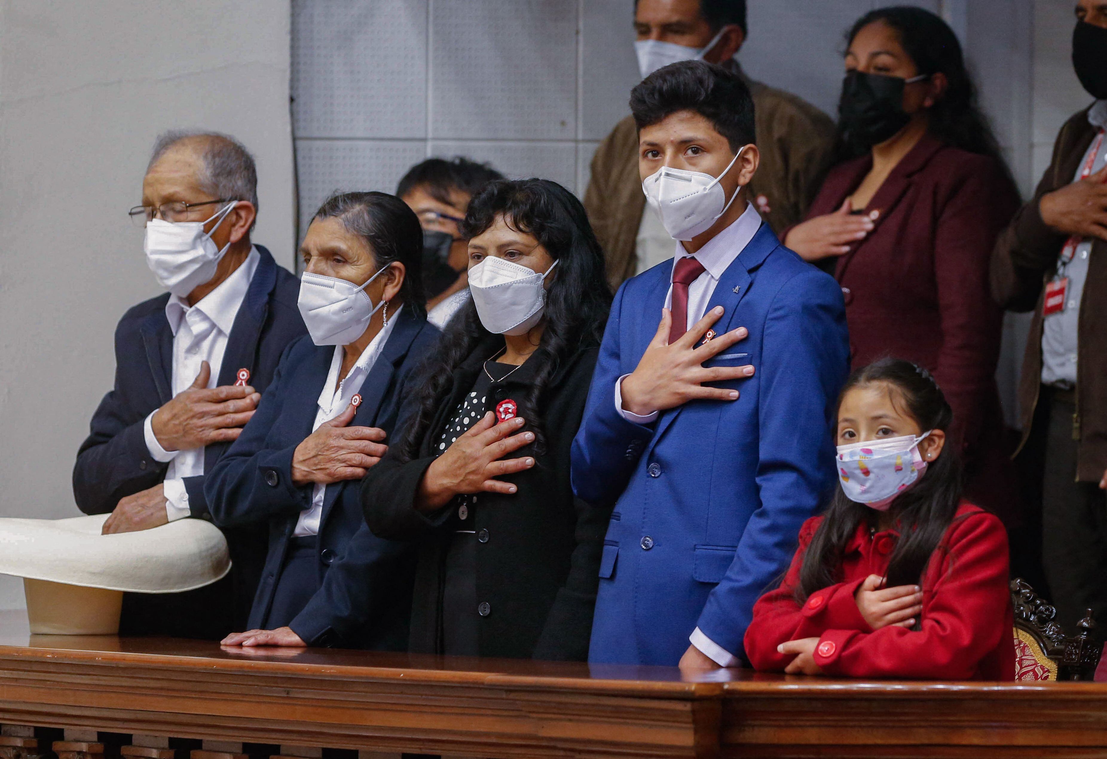 “Juro por Dios, por mi familia, por los campesinos, por los pueblos originarios, por los ronderos, pescadores, profesionales, niños, adolescentes, que ejerceré el cargo de presidente de la República en el periodo 2021-2026. Juro por los pueblos del Perú, por un país sin corrupción y por una nueva Constitución”, declaró Castillo.