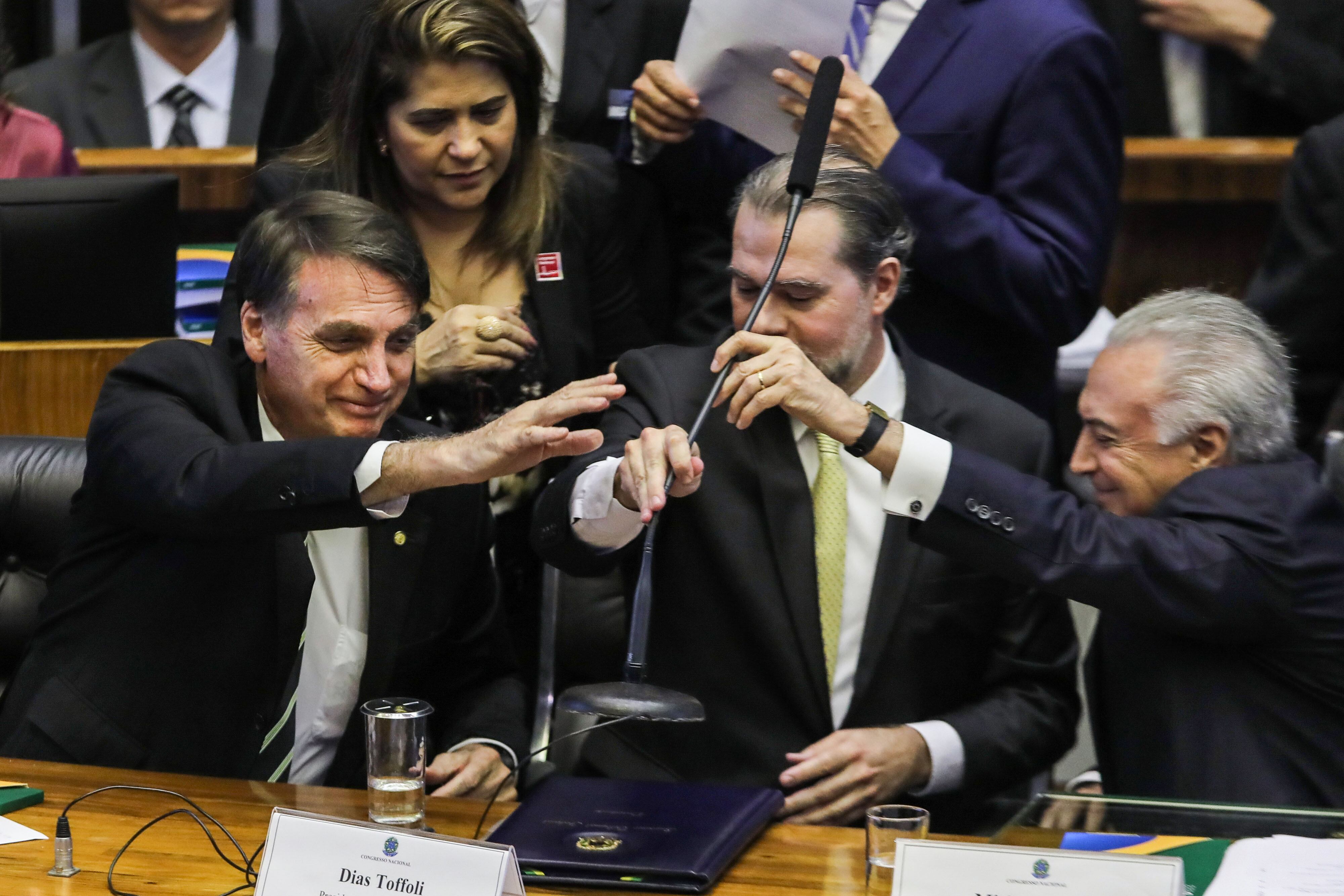 Muy sonriente y con una corbata a rayas, el ultraderechista llegó al Congreso con un convoy de autos negros, protegido por un numeroso equipo de seguridad. Dentro del plenario, cantó el himno brasileño con la mano en el pecho y se retiró después de los discursos en medio de un enjambre de asesores y periodistas.