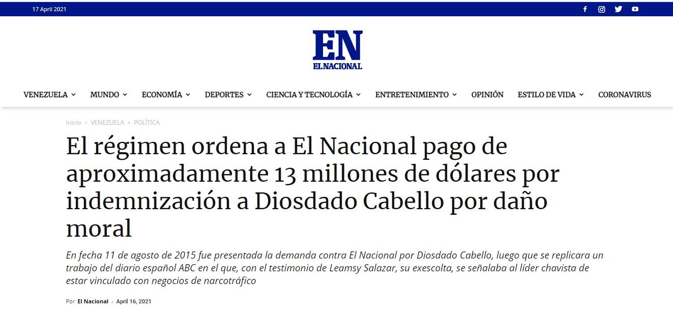 LEA MÁS: Diario venezolano condenado a pagar indemnización a Diosdado Cabello