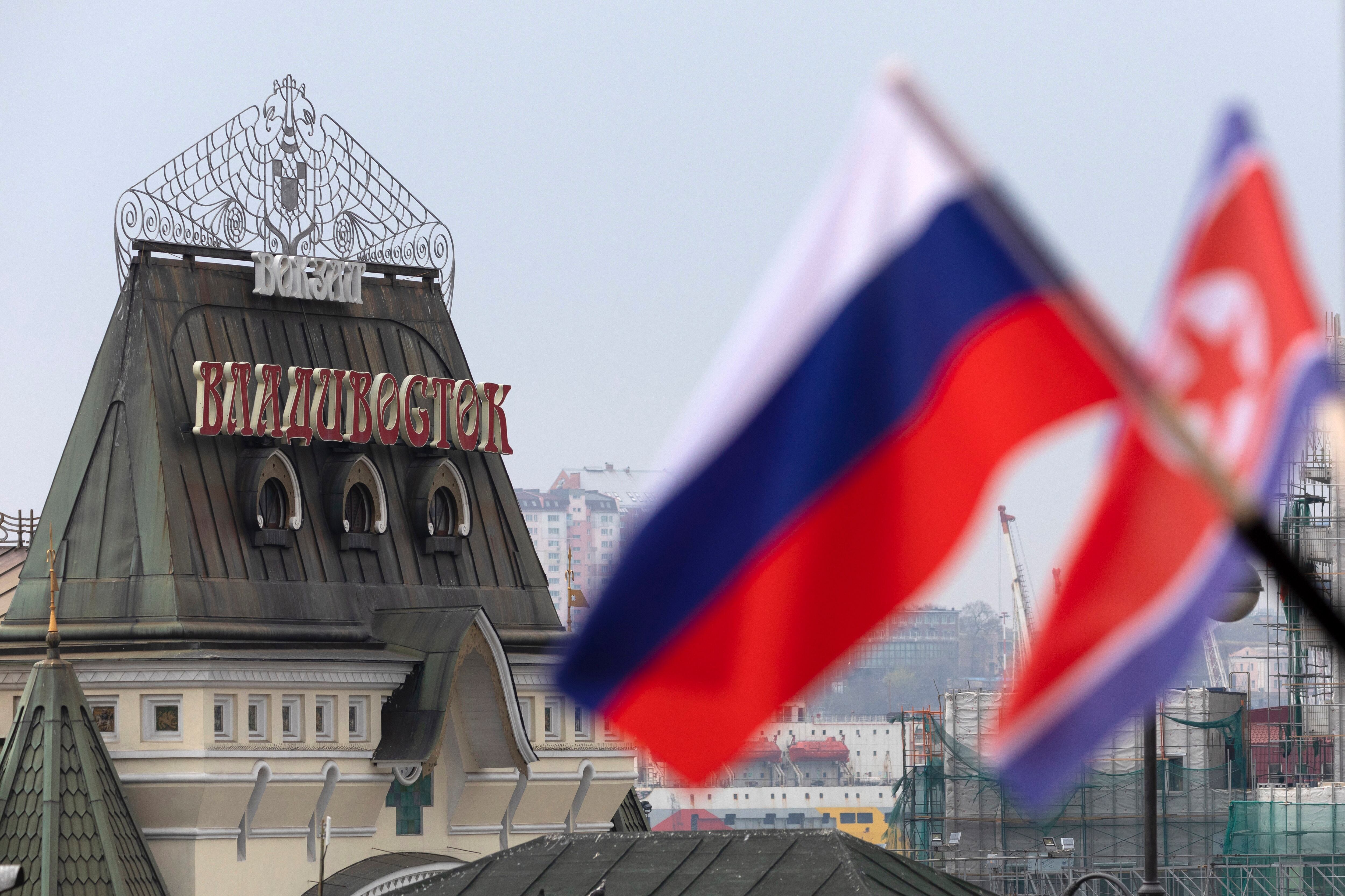 En la isla Ruki, frente a la ciudad portuaria de Vladivostok, donde se celebrará la cumbre, se izaron banderas rusas y norcoreanas.