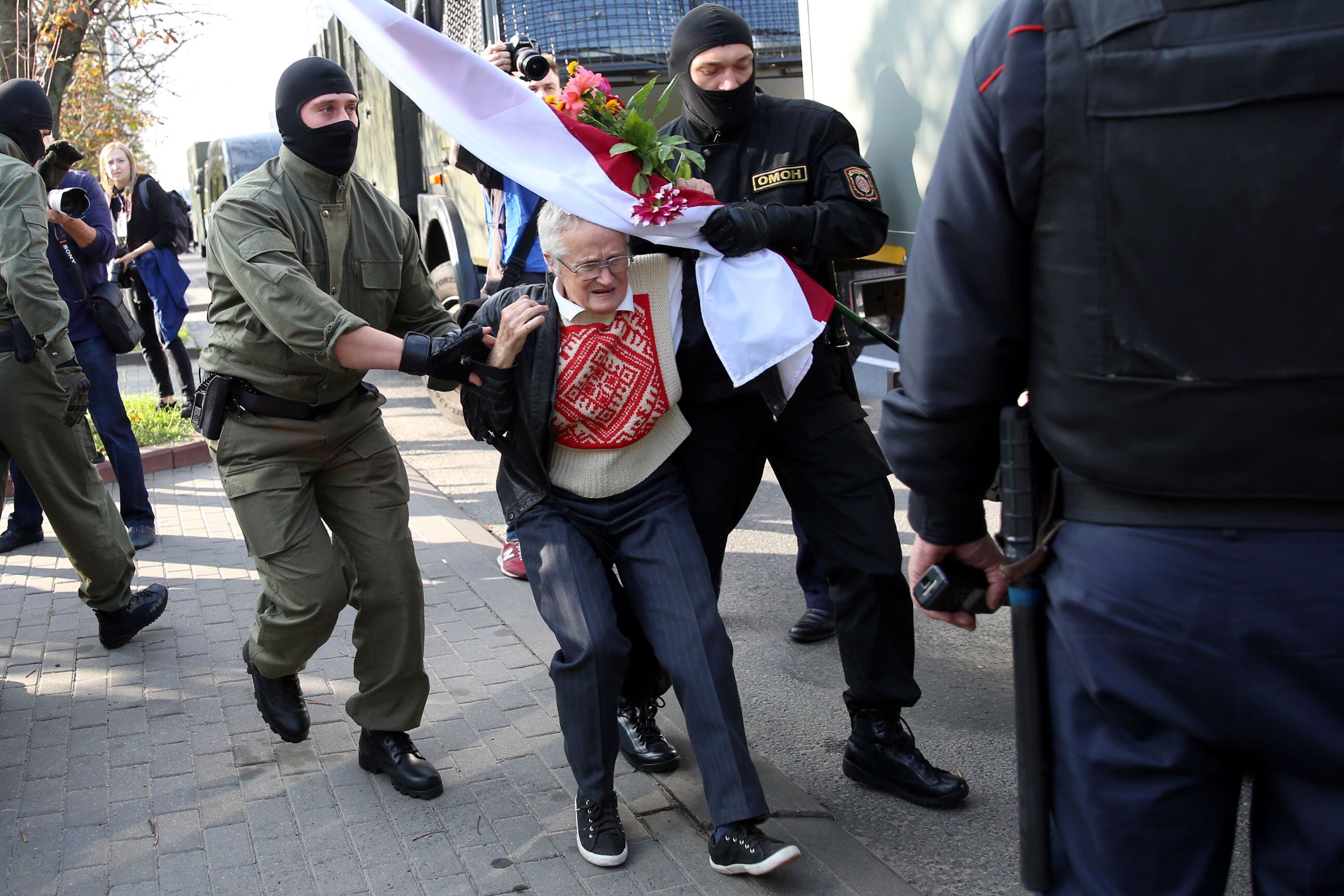Con su bandera roja y blanca, símbolo de la oposición y antiguo estandarte de la Bielorrusia independiente, esta bisabuela protesta desde 1988, aún en la época soviética, para exigir la liberación de los presos políticos o para proteger un monumento dedicado a las víctimas de la represión estalinista.