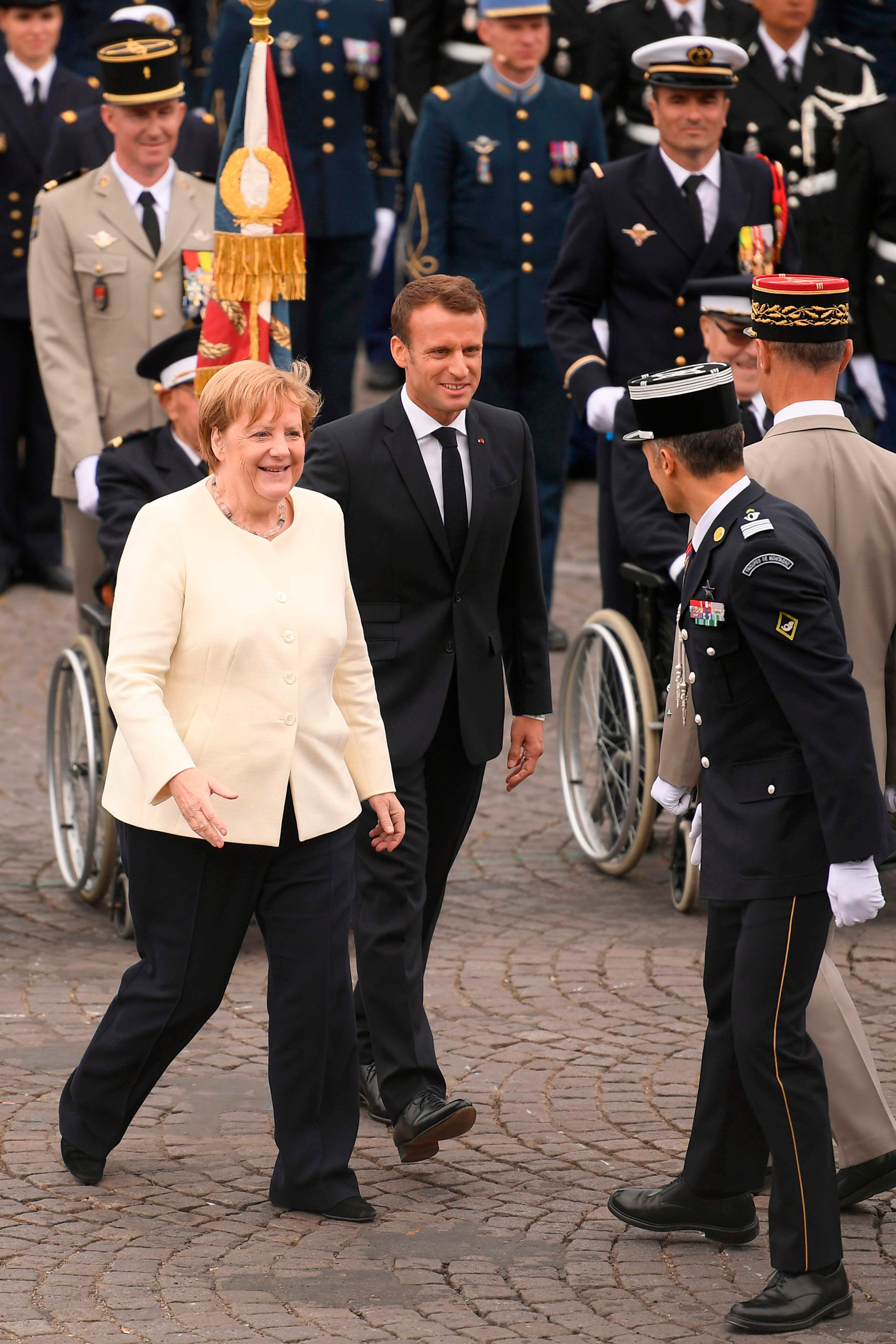 “Es un gran gesto para una política de defensa europea”, aseguró Merkel al término de la ceremonia. “Estamos honrados por la participación alemana, es un símbolo de la fuerte cooperación franco-alemana” agregó.