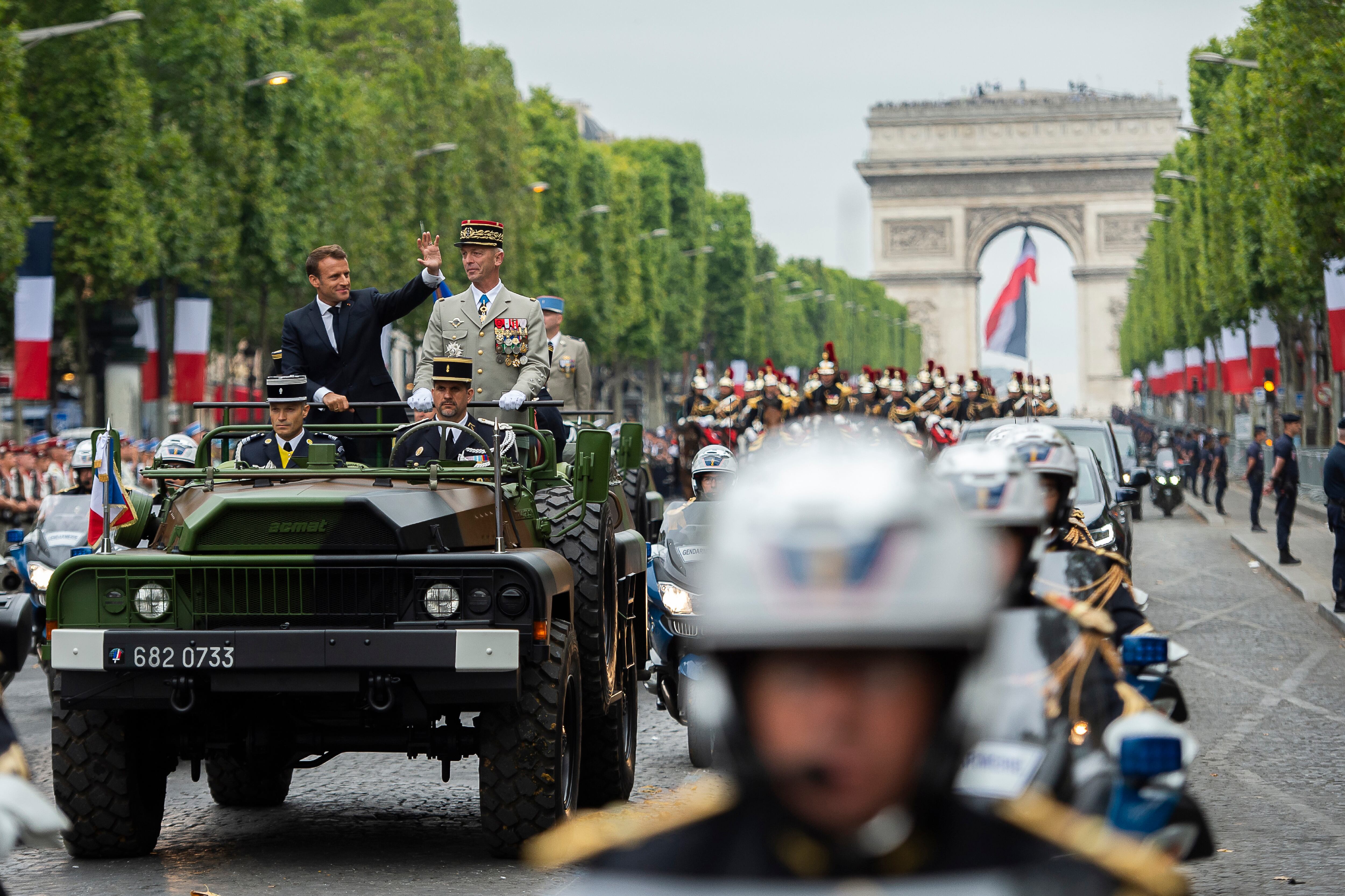 Macron, quien celebra su tercer desfile de fiesta nacional desde su elección en mayo del 2017, se desplazó por los Campos Elíseos de París a bordo de un coche de mando junto a su jefe de Estado Mayor, escuchándose a su paso algunos silbidos.