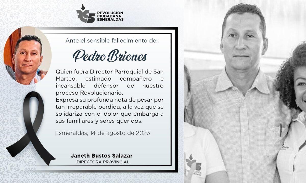 Cinco días después del asesinato del candidato presidencial Fernando Villavicencio, una nueva figura política perdió la vida de manera violenta en el país. Pedro Briones, dirigente del partido Revolución Ciudadana en Esmeraldas, fue asesinado por un impacto de bala este lunes, según informaron miembros de su partido.