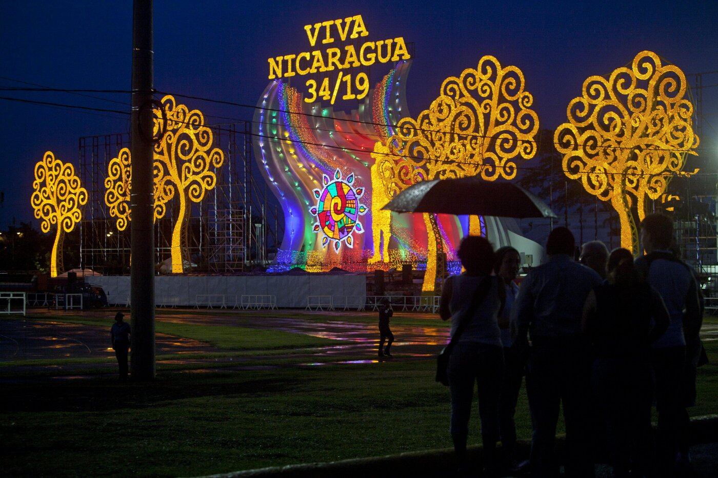 En la plataforma principal en la plaza, enormes árboles de metal con luces y una silueta del héroe nacionalista Augusto César Sandino, pantallas con propaganda oficial y parlantes, forman parte de la impresionante escenografía montada para este acto.