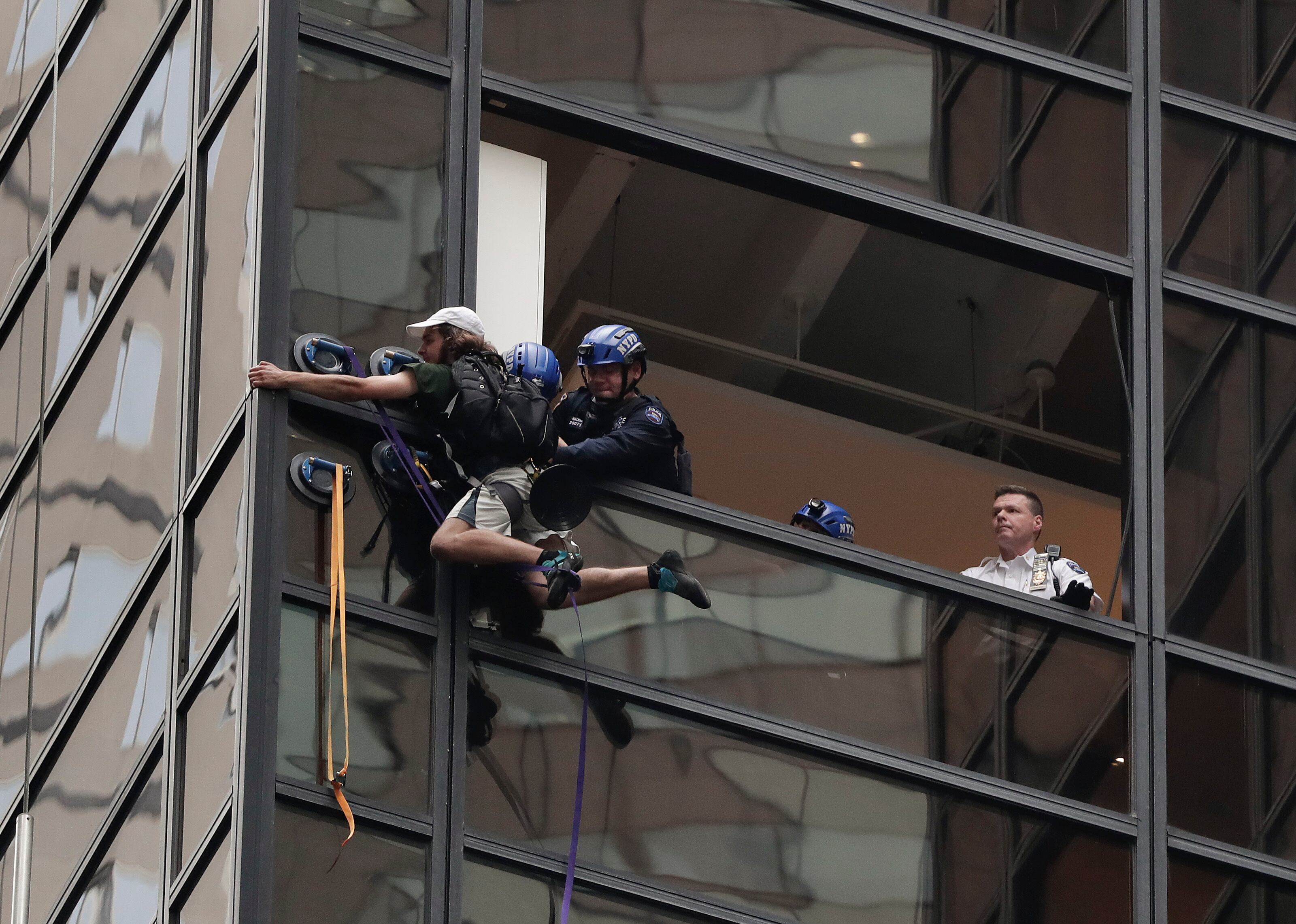 Luego hicieron descender una plataforma para limpia vidrios a la altura del sujeto y retiraron un gran panel de vidrio varios pisos arriba del hombre, cuyos motivos para escalar el rascacielos aún se desconocían.