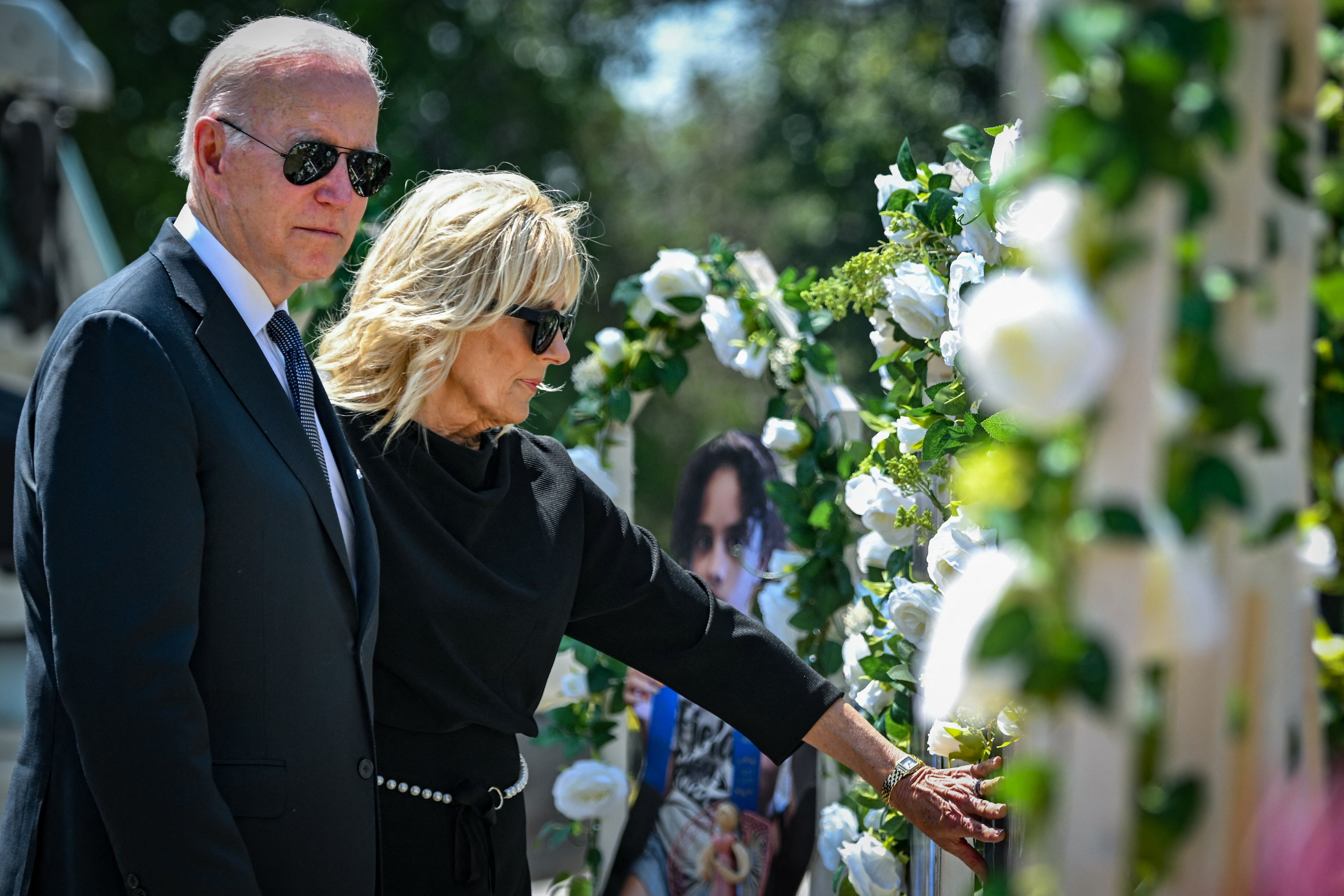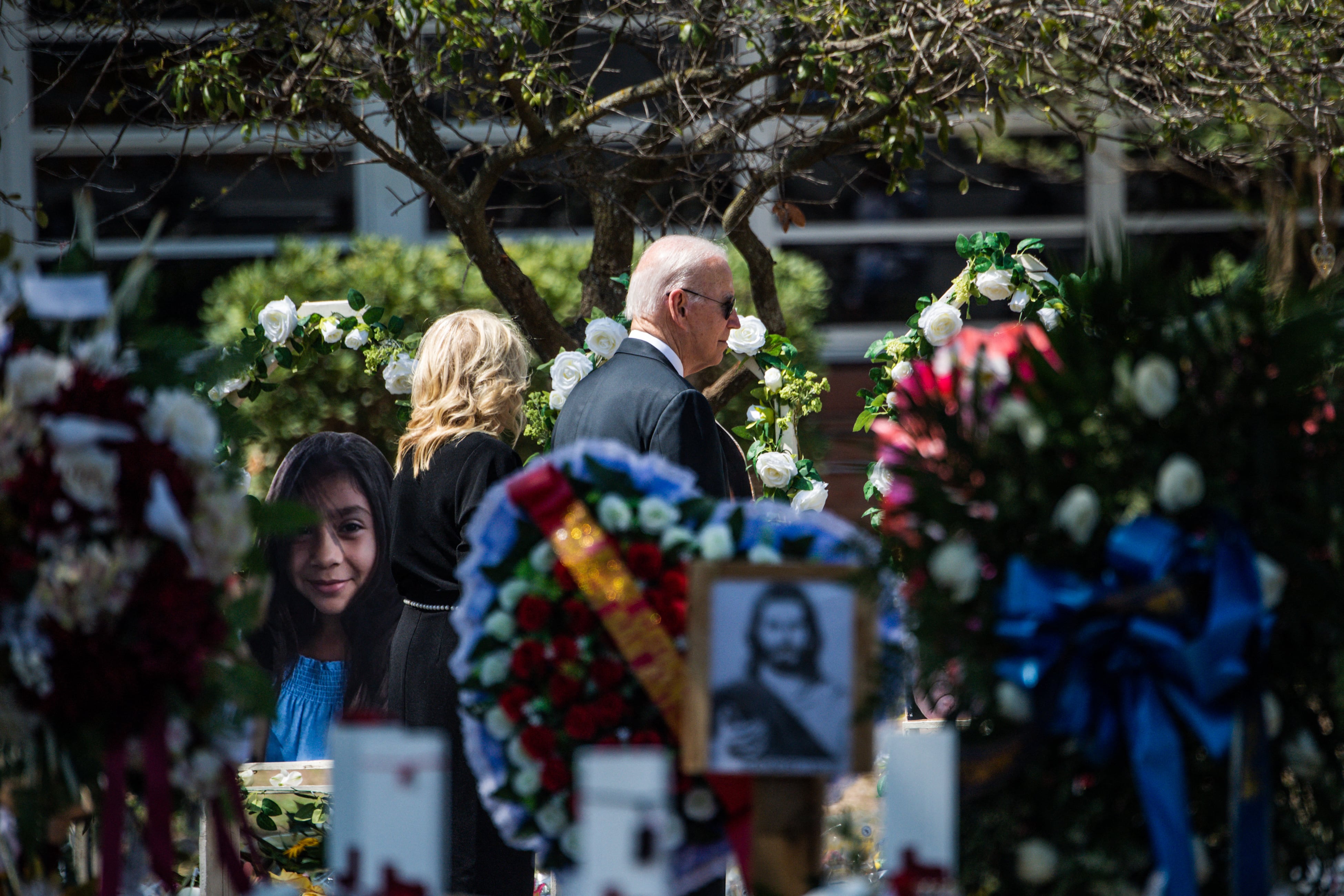 Acompañado de su esposa Jill Biden, el presidente estadounidense se dirigió primero al santuario levantado frente a la escuela, y luego a una misa católica en la iglesia del Sagrado Corazón.