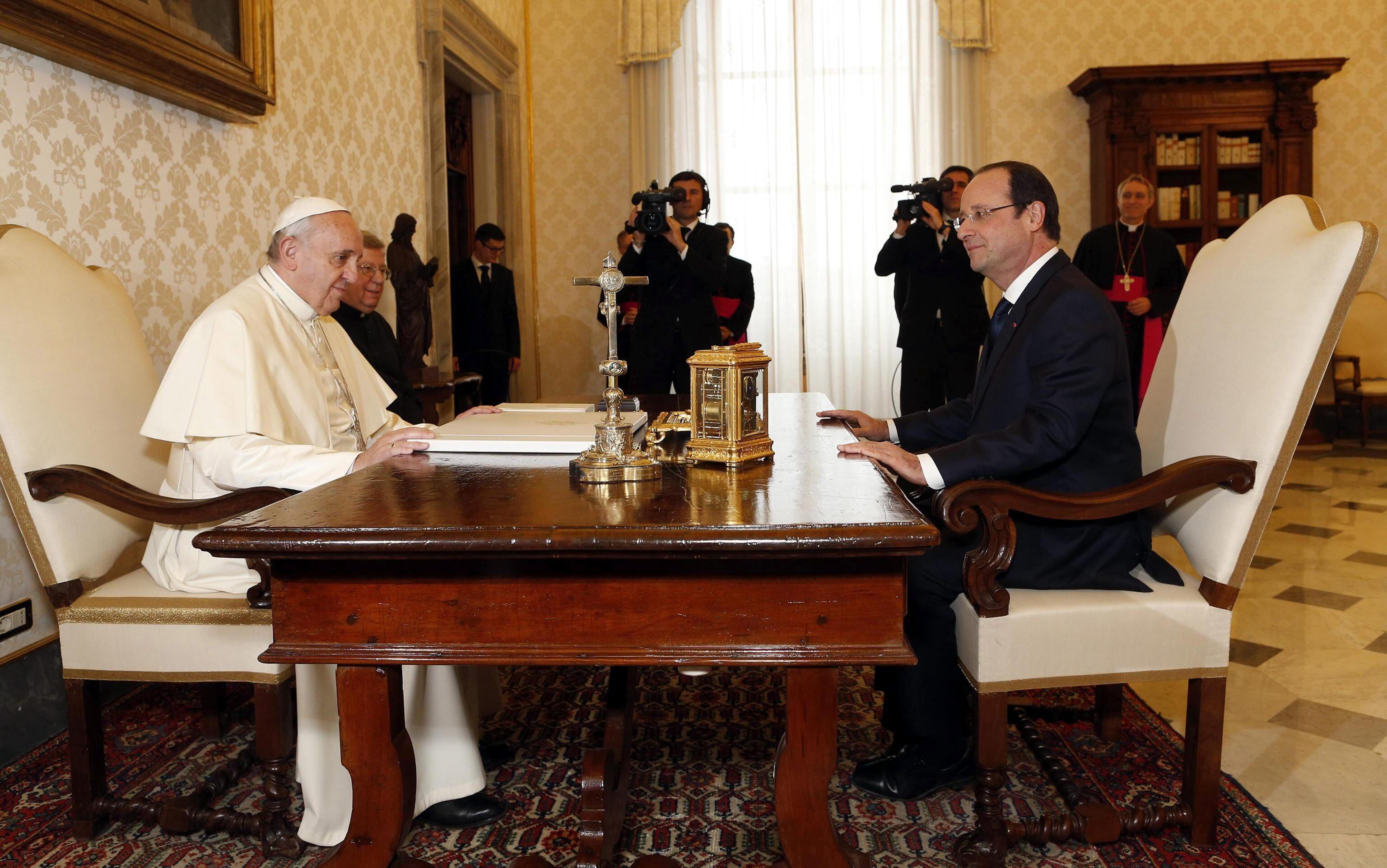 Hollande mantuvo una reunión a puerta cerrada de 35 minutos con el papa Francisco, durante la cual reiteró al pontífice que Francia "defiende en todos lados la libertad religiosa".