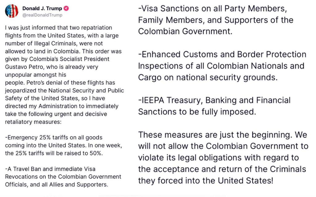 “Me acaban de informar que a dos vuelos de repatriación desde Estados Unidos, con un gran número de Delincuentes Ilegales, no se les permitió aterrizar en Colombia. Esta orden fue dada por el presidente socialista de Colombia, Gustavo Petro, que ya es muy impopular entre su pueblo. La negativa de Petro a estos vuelos ha puesto en peligro la Seguridad Nacional y la Seguridad Pública de los Estados Unidos, por lo que he ordenado a mi Administración que tome de inmediato las siguientes medidas de represalia urgentes y decisivas”, afirmó Trump.