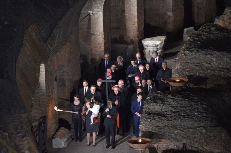 El sugestivo recorrido alrededor del monumento romano se celebra este año en un clima particular, marcado por las fuertes medidas de seguridad adoptadas desde los atentados del domingo en Egipto contra dos iglesias de cristianos coptos y que costaron la vida a 44 personas.