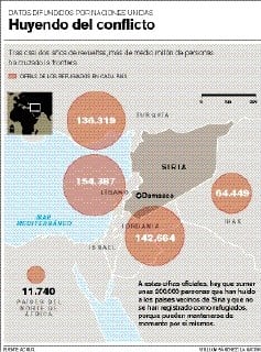 Ginebray El Cairo. EFE. El número de refugiados sirios en Líbano, Jordania, Irak, Turquía y el norte de África ha superado ya el medio millón, con una media diaria de 3.000 personas que solicitan ayuda al Alto Comisionado de la ONU para los Refugiados (Acnur) .