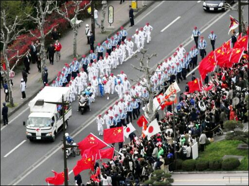 Sólo dos policías del Ejército chino con chándal blanquiazul estaban presentes al lado de la llama, de acuerdo con la voluntad de las autoridades japonesas. La omnipresencia de estos policías chinos en Londres, París y San Francisco habían provocado una viva controversia y atizó la cólera de los manifestantes antichinos.