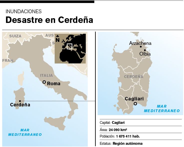 Roma. AP. La isla italiana de Cerdeña, en el Mediterráneo, apreciada por sus playas de arena blanca y mar cristalino, quedó convertida ayer en una masa de escombros y lodo después que una tormenta calificada de “apocalíptica” mató a por lo menos 17 personas, derribó puentes y arrastró automóviles.