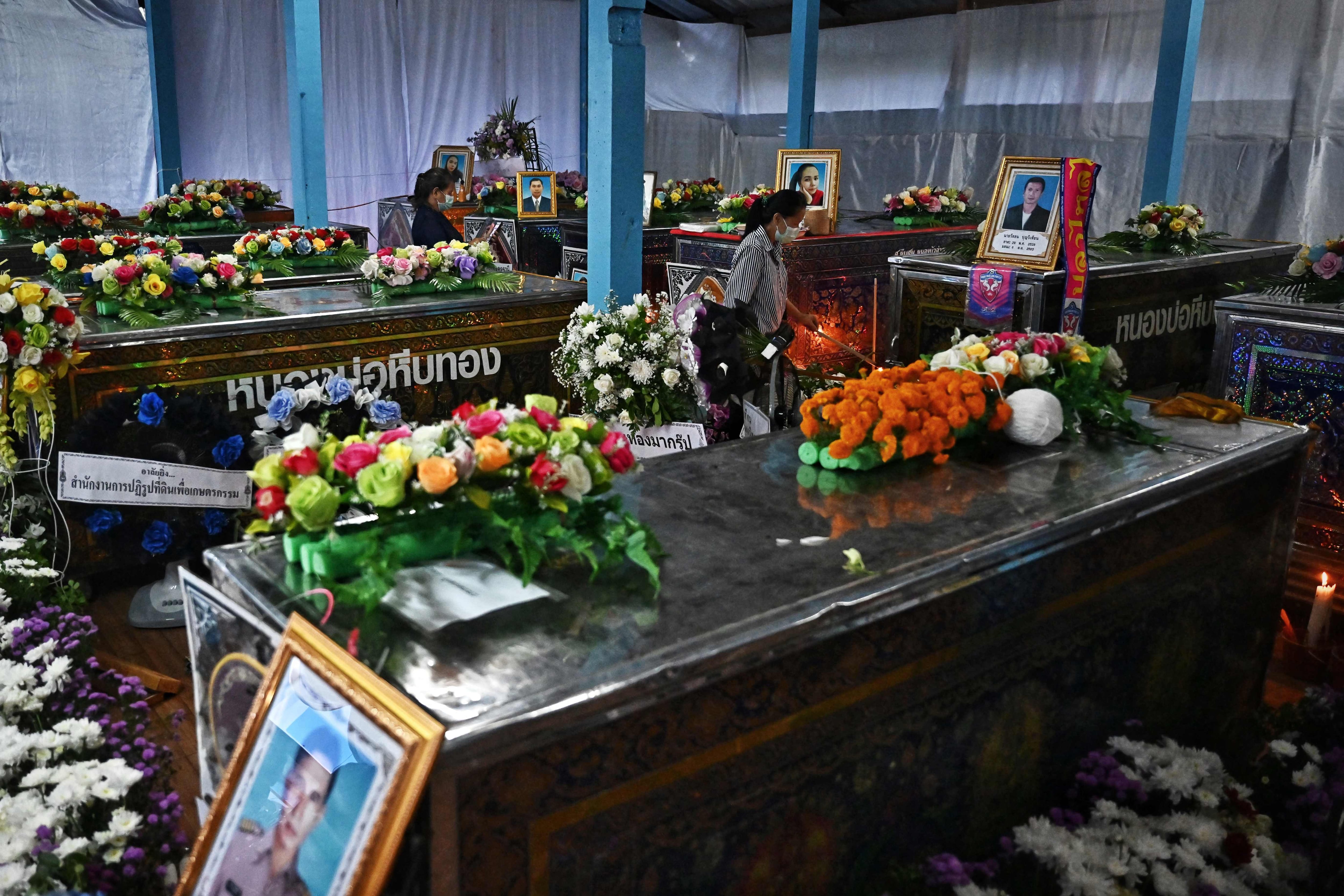 Los familiares de las víctimas se reunieron en un templo budista el sábado, marcando el inicio de tres días de rituales funerarios. El incienso se mezclaba con el olor de los ramos de flores colocados alrededor de los ataúdes, muchos de ellos acompañados de fotos de los rostros sonrientes de los niños, asesinados por Panya Khamrab, un expolicía.