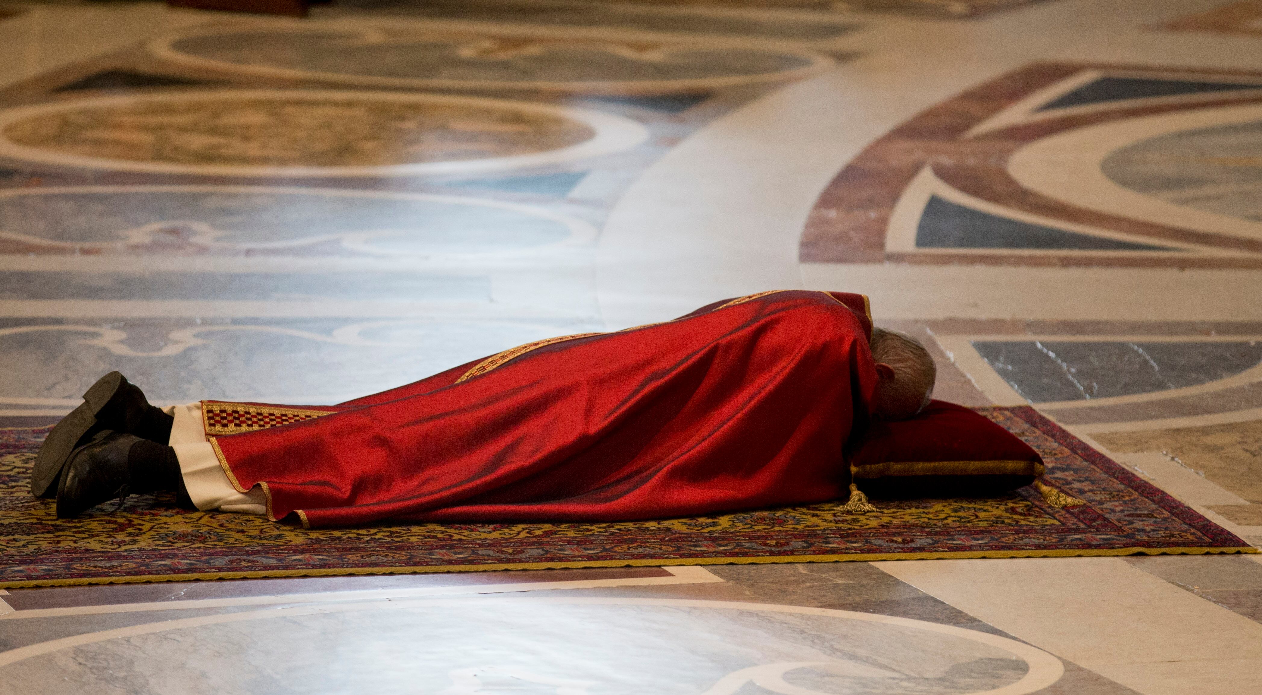 El pontífice, ataviado con paramentos rojos, llegó al templo vaticano y permaneció dos minutos tumbado sobre una alfombra situada ante el altar bajo el cual se considera que están los restos del apóstol San Pedro.
