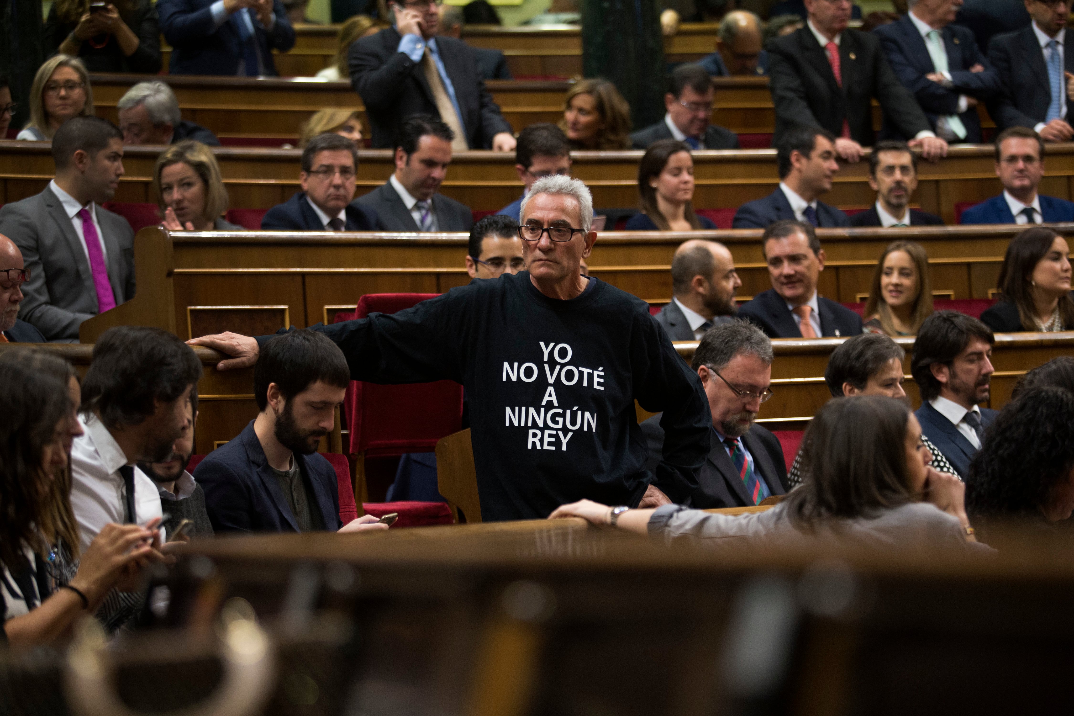 Otro diputado de Podemos, el sindicalista andaluz Diego Cañamero, lucía una camiseta con la leyenda "Yo no voté a ningún rey".