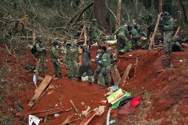 Posteriormente, unos 400 miembros del Ejército, la Policía y la Armada descendieron por cuerdas desde los helicópteros para copar el campamento, donde encontraron los siete cadáveres.