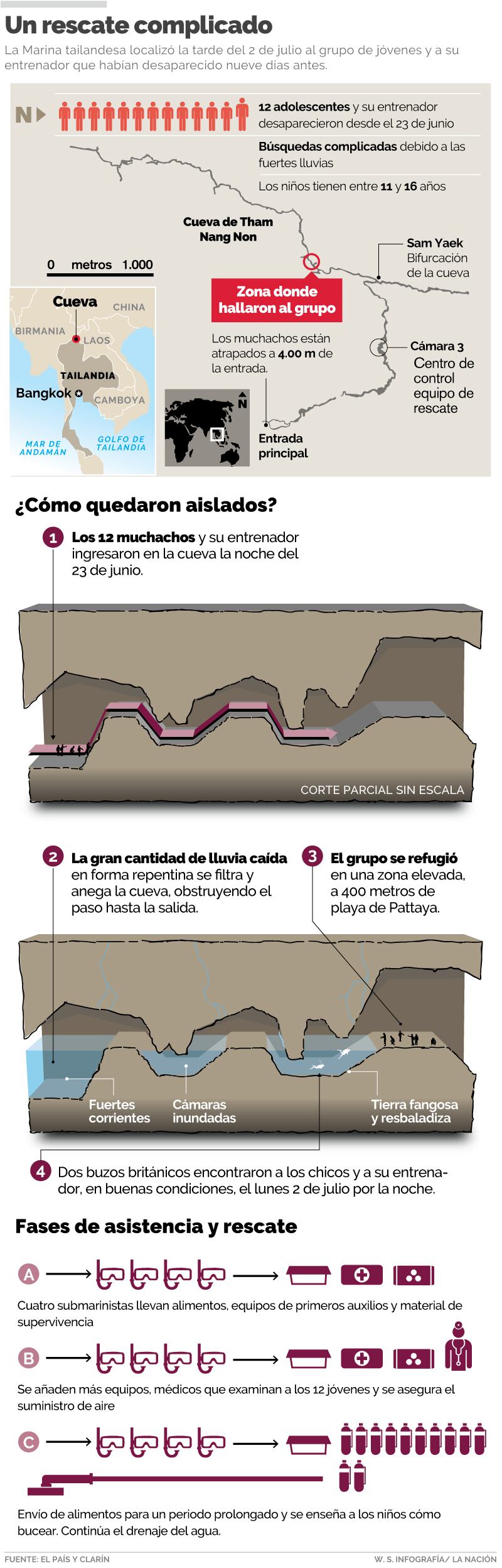 La lluvia monzónica en esa zona podría ocasionar más inundaciones en esta compleja red subterránea de cuevas de unos diez kilómetros de largo y es esa situación el principal desafío para los cuerpos de rescate. Se teme que haya nuevas precipitaciones antes de que logren sacar a todo el grupo.