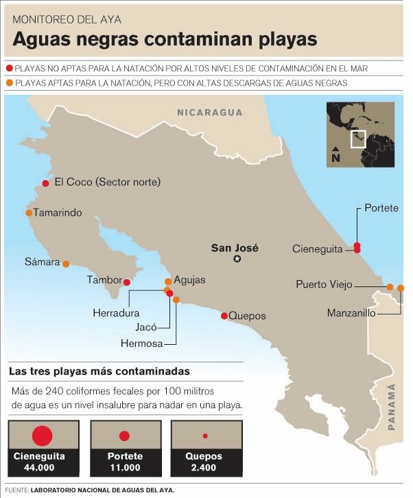 De acuerdo con el informe del Laboratorio de Acueductos y Alcantarillados (AyA), dichas descargas no elevan aún la cantidad de heces en el mar, pero representan un riesgo porque podrían afectar la calidad del agua a futuro.