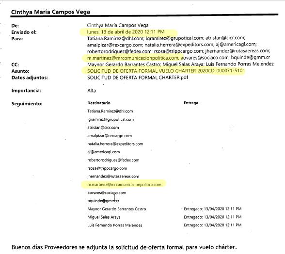 Ese documento firmado por Vindas, junto a la nota de invitación N.° DABS-AABS-0604-2020, fue remitido a los 12 proveedores el lunes 13 de abril, a las 12:11 p. m., según consta en el expediente. A Miren Martínez se consignó que se le envió al correo m.martinez@mrcomunicacionpolitica.com.