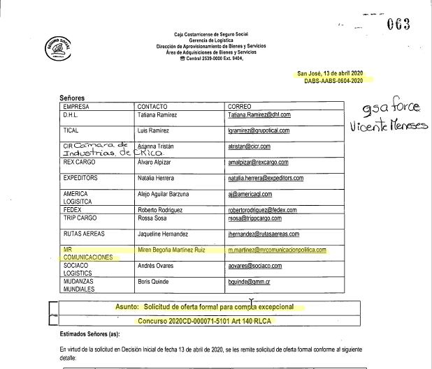 La Gerencia de Logística de la CCSS invitó a la empresa MR Comunicaciones Políticas, de la periodista española Miren Martínez Ruiz, a que ofertara una opción de vuelo chárter para traer una donación de insumos médicos desde China, en abril pasado, pese a que la firma de consultoría en comunicación y relaciones públicas carece de experiencia acreditada en el transporte internacional de carga.