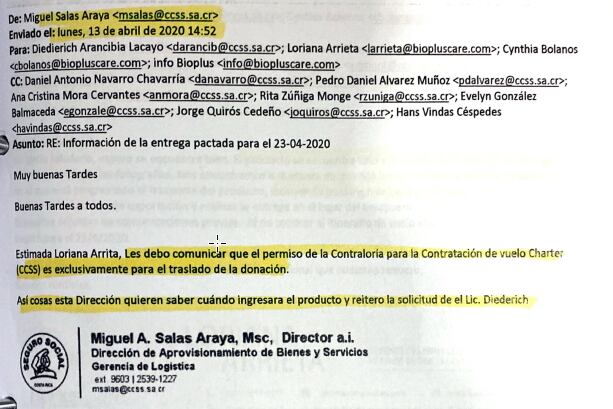 “Estimada Loriana Arrieta. Les debo comunicar que el permiso de la Contraloría para la contratación del vuelo chárter de la CCSS es exclusivamente para el traslado de la donación”, consignó Salas el lunes 13 de abril a las 2:52 p. m.