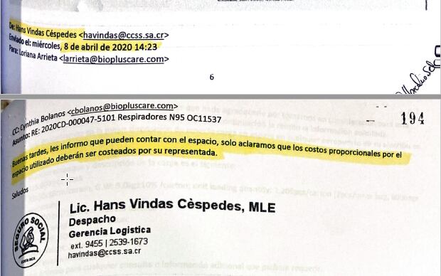 De seguido, Arrieta le informa, a las 3:55 p. m., que en la noche le dará la información solicitada y a las 4:18 p. m. Vindas le responde: “Gracias, quedamos a la espera” y copia a su superior Luis Fernando Porras, el gerente de Logística, quien desde agosto está suspendido de su cargo por aparentes irregularidades en la contratación de millones de mascarillas, cuestionamientos que fueron dados a conocer por este medio.