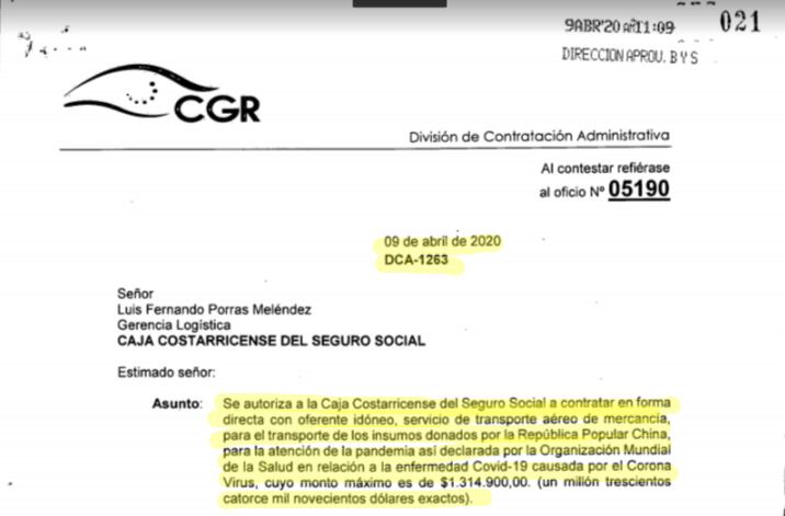 Así lo dejó claro la Contraloría General de la República (CGR), el 9 de abril, día en que emitió el oficio N.° DCA-1263 para autorizar a la Caja a realizar esa contratación e incluso, enlistó los productos y cantidades que, únicamente, se debían traer desde China.