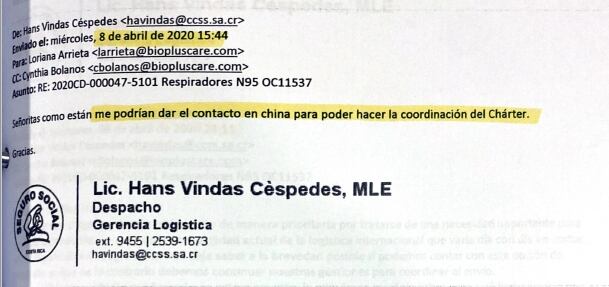 Además, le pidió a la gerente de Desarrollo de Negocios de Bioplus Care que le indicara quién le había ofrecido el espacio en el chárter ante lo que ella respondió el 14 de abril: “(…) Este tema fue discutido con Hans Vindas”.