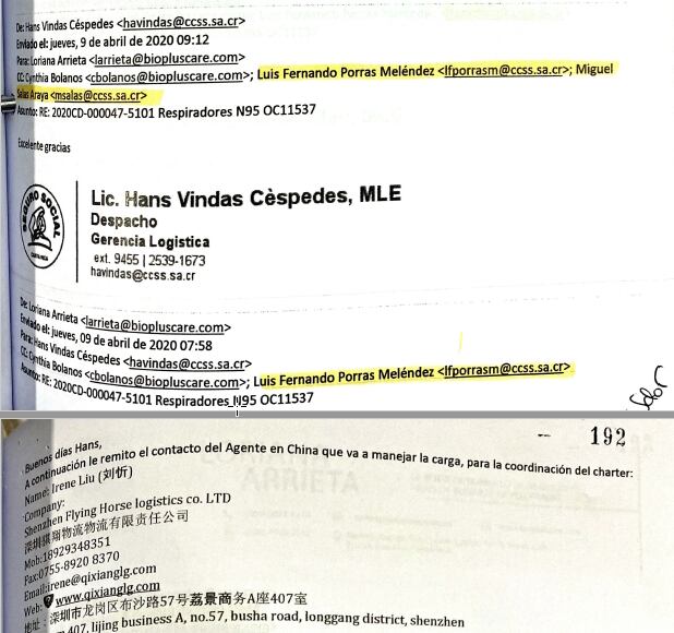 Porras aparece copiado en otros nueve correos donde se dan detalles, entre otras cosas, del contacto de Bioplus Care en Shanghái y de las dimensiones de la carga. Al mismo tiempo, se incluyó en la cadena de mensajes a Miguel Salas, director a. i. de Aprovisionamiento de Bienes y Servicios, y quien fue trasladado a un cargo administrativo también por las supuestas anomalías.