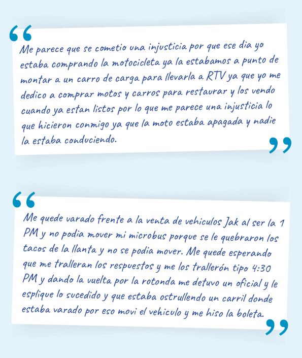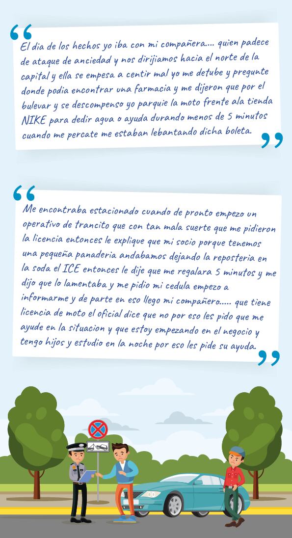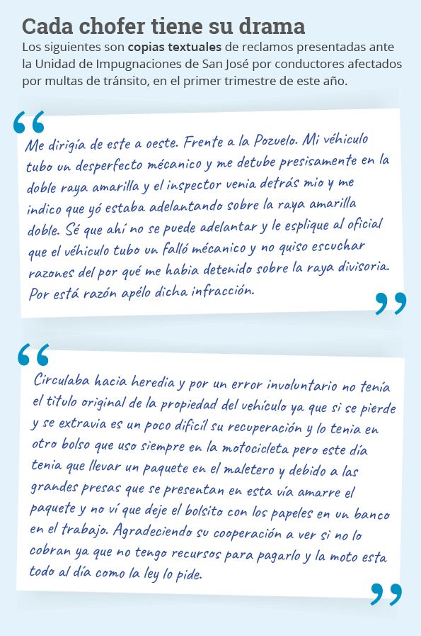 La Nación tuvo acceso a varios formularios de objeción en los que, incluso, los infractores admiten haber cometido la falta, pero alegan no tener dinero para cancelar la sanción o piden que se les perdone porque tienen hijos, estudian de noche o acaban de comenzar un negocio.