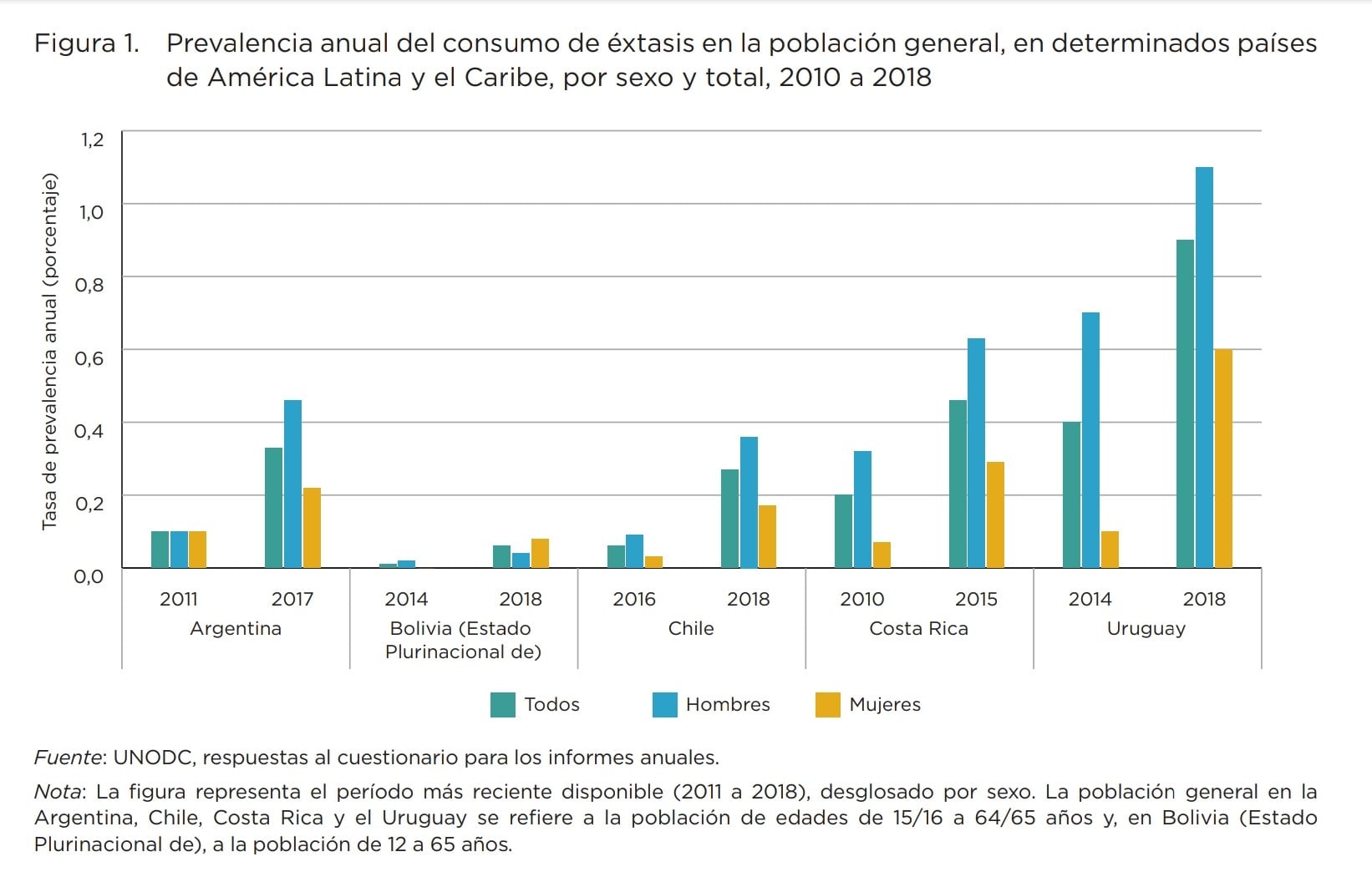 En realidad, la investigación de la ONU sí muestra un aumento en la prevalencia anual del consumo de éxtasis en la población de determinados países, entre ellos, Costa Rica. “En todos los países de la región que cuentan con datos recientes, se registraron tasas de prevalencia más altas entre los hombres que entre las mujeres, salvo en Bolivia”, explica el documento académico.