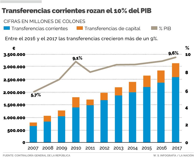 “Se tiene que las transferencias son el principal rubro de gasto del Gobierno, crecen a una tasa elevada y, en su mayoría, responden a destinos específicos de carácter legal o constitucional, no con base en las posibilidades de la hacienda pública ni de la capacidad ejecutora de la institución receptora", analizó la Contraloría General de la República sobre las transferencias en su Memoria Anual 2017.